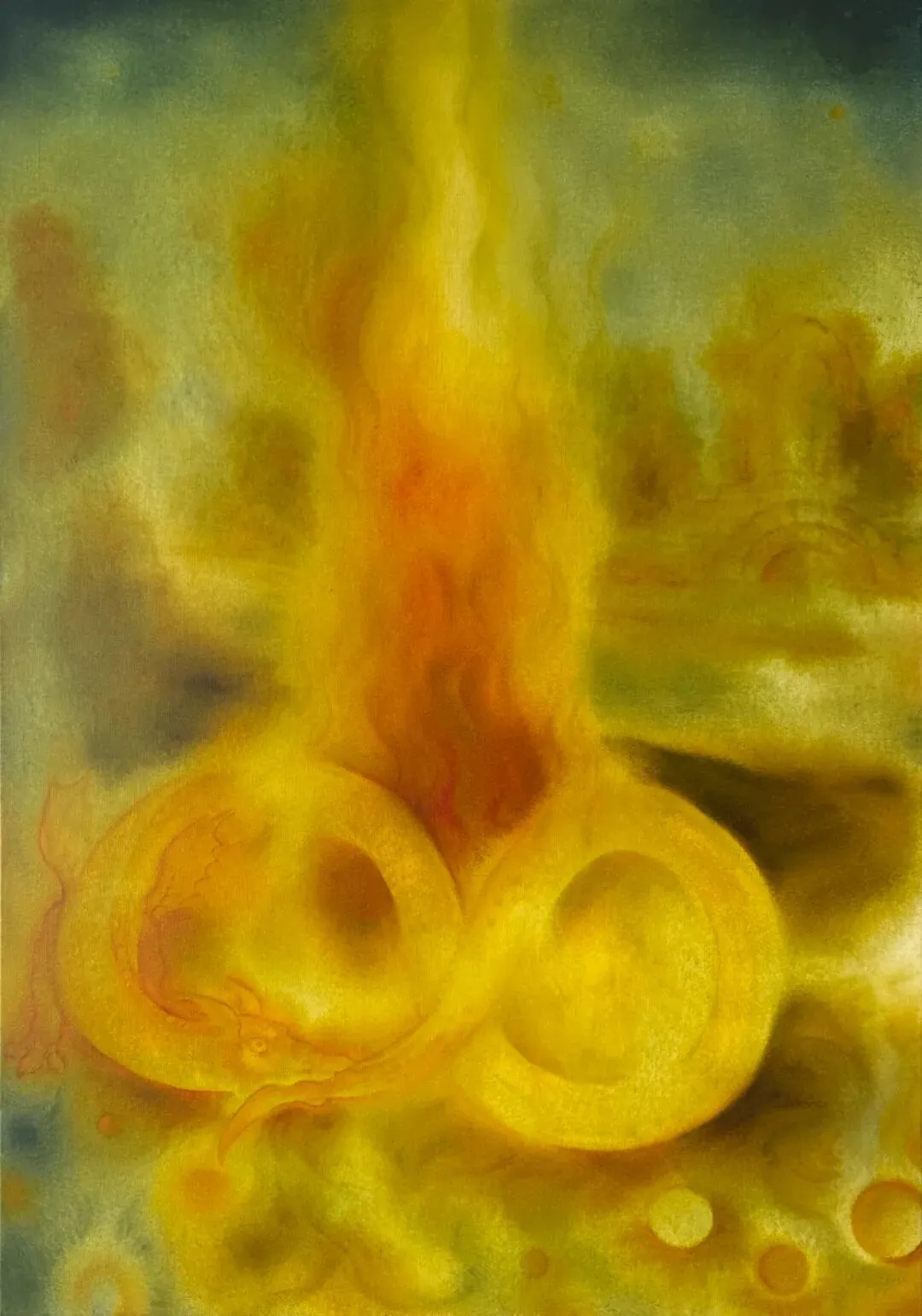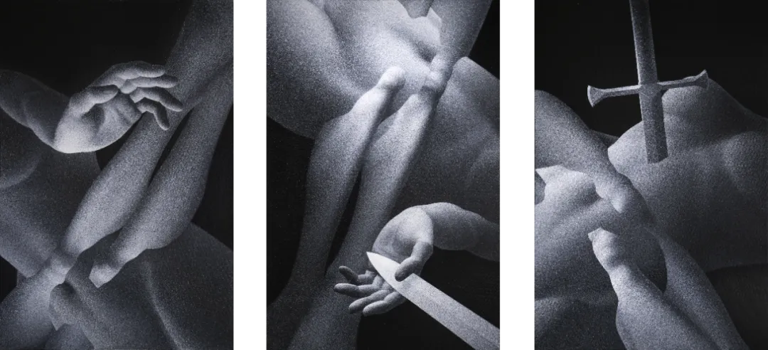 肉身的主题延续存在,变得更加绞缠和亲昵。手、躯干与肢体模糊地融化在一起,又被极具侵略性、边缘锋利的巨大利刃刺穿,分割清晰的光影结构。与理性表征相对的是朦胧而强烈的内在情绪:衔尾的蛇上方喷吐熊熊燃烧的火,使欲望在无穷的时间里蔓延。