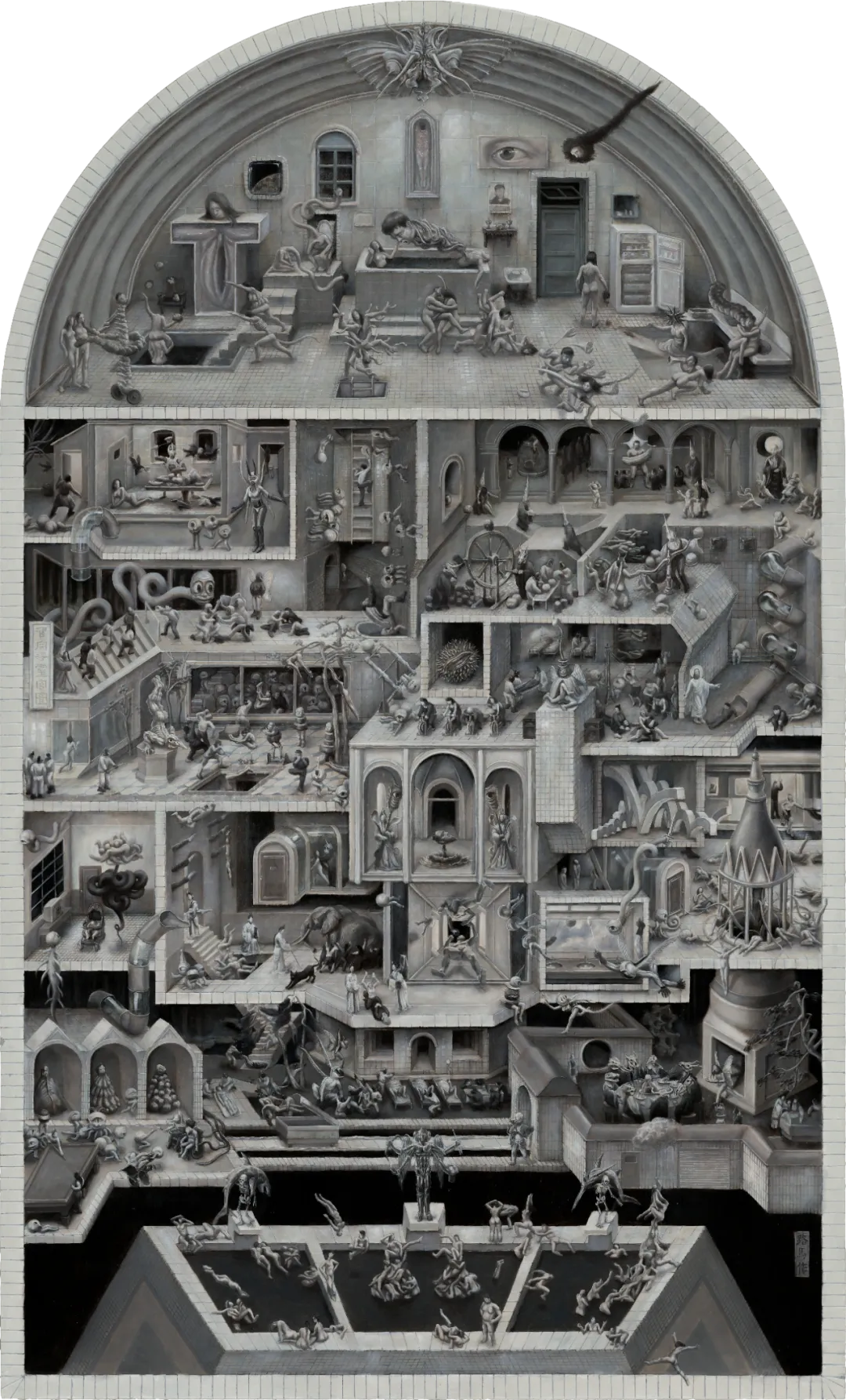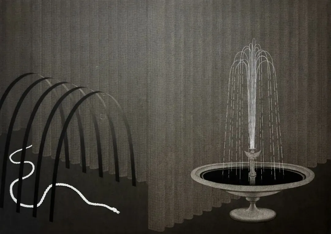 顶端的房间彰示着极端的终章。喷泉作为城邦与文明起源的象征,以流水暗示更迭与传递。尖顶的花窗下,细致描绘的建筑内部结构直接回应了所多玛的叙事。人影幢幢,混乱与秩序同时到达极点,形成以欲念驱动的精密机器。两侧,对仗的拱门如同物理的真谛,迎合代表灵性的日落月升。局部的眼眸呼应合十的手,似古典的“爱人之眼”与信仰崇拜的重叠。来自神话的叙事被重新书写,以流动的状态迎来盛大的终结。