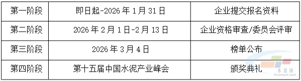 3、由评审专家委员会提出评审意见,确定最终获奖名单,并于“第十五届中国水泥产业峰会”统一颁授奖牌。