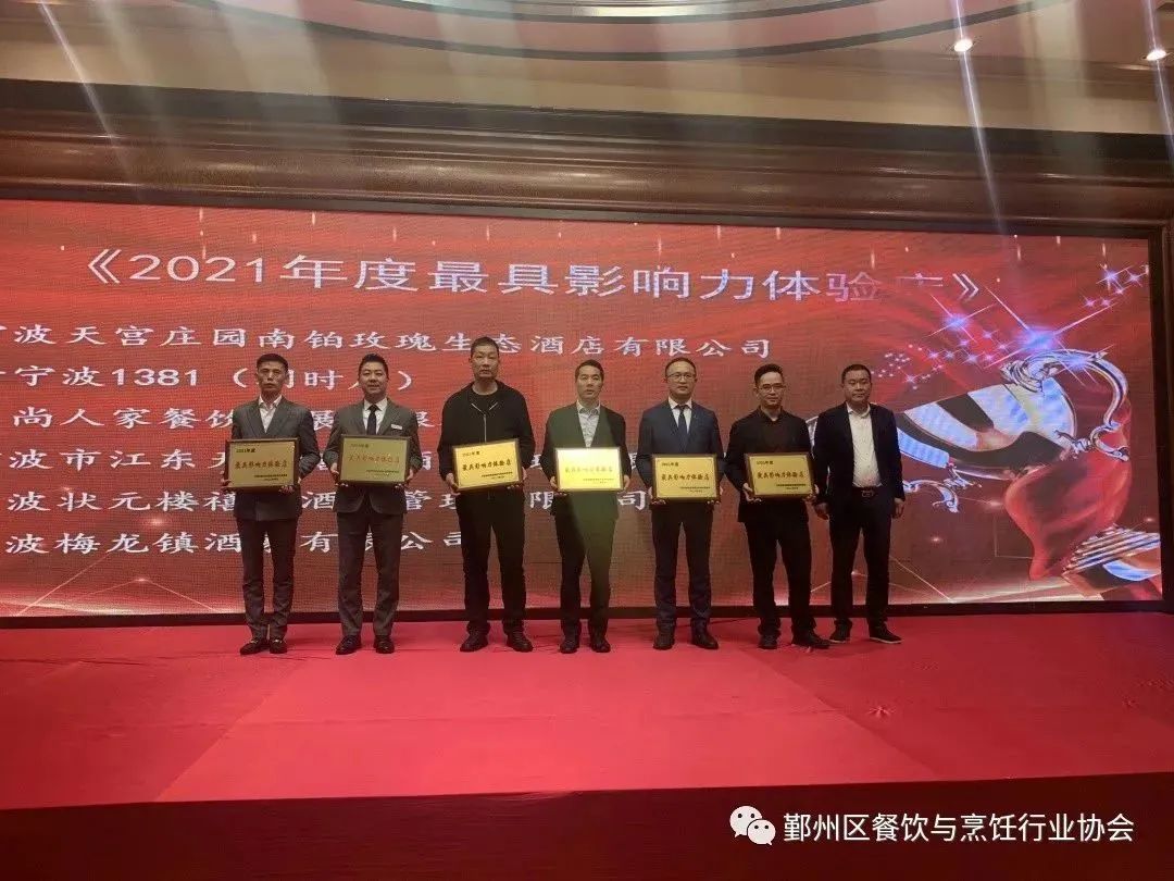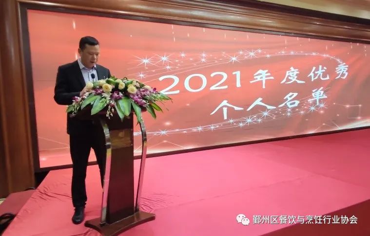 胡雄副会长宣读通报2021年度优秀个人和先进集体名单及表彰。有55名员工获得《优秀管理者》、《最佳服务之星》、《美食烹饪工匠》、《美食推广之星》各奖项,20家企业获得《先进集体》奖,宁波天宫庄园南铂玫瑰生态酒店有限公司等6家企业获得《最具影响力体验店》。