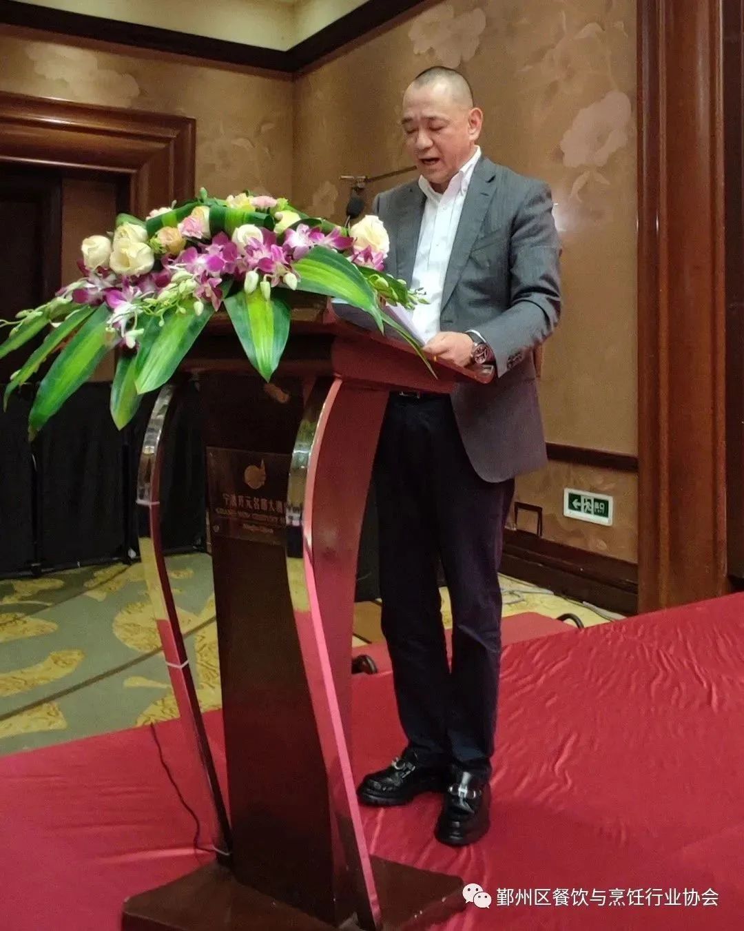 开元名都总经理来荣发副会长宣读通报获得了2022年度鄞州区餐饮与烹饪行业协会 “十佳优秀餐饮品牌企业”名单及表彰,宁波陈记天滋久餐饮管理有限公司等10家企业获此殊荣。