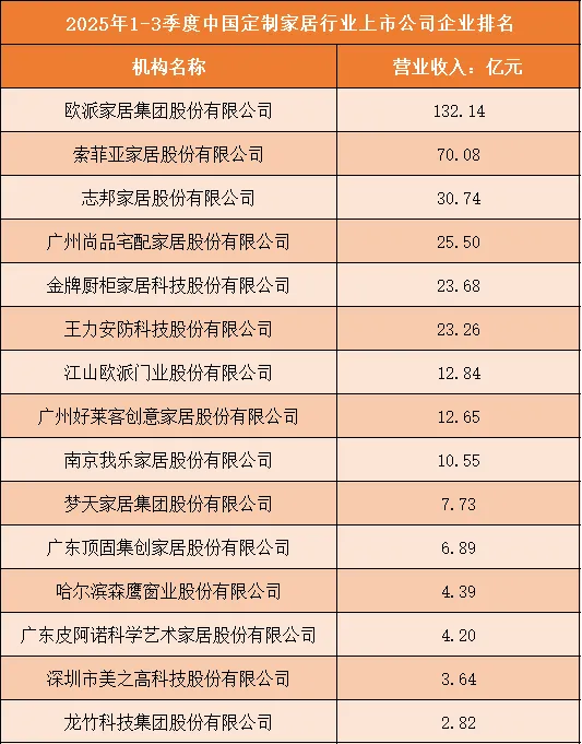 根据申万行业分类,2025年1-3季度中国定制家居行业上市公司按营业收入排名如下:(A股上市公司)