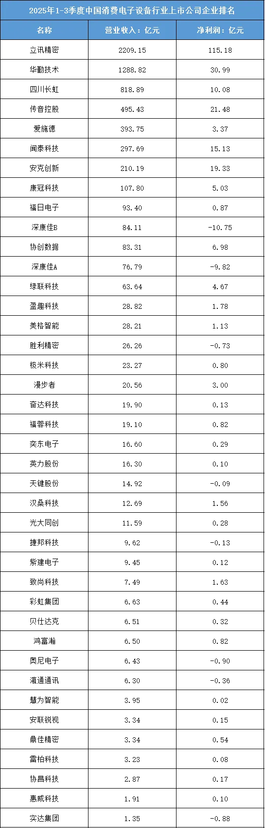 根据东财行业分类,2025年1-3季度中国消费电子设备行业上市公司企业排名如下:(A股上市公司)