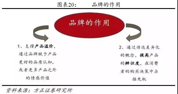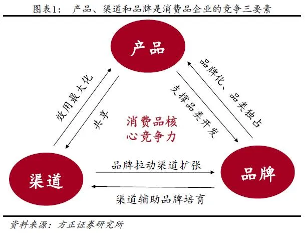 产品、渠道和品牌是消费品企业的竞争三要素,从逻辑上来看,产品、渠道和品牌相辅相成,共同作用,缺一不可。其中,产品是核心,消费品满足人们的基础需求,通常技术含量低,同质化严重,所以通过品牌来实现差异化或者品类延伸就是企业最通常的竞争手段,但是好的产品就是最强的品牌,比如大家熟知的茅台酒、老干妈等;渠道是实现手段,消费品行业市场化完全,竞争激烈,无论品类延伸还是品牌创新,都要依赖渠道;而品牌则是维系企业生命力的核心因素,品牌通过流行度、认知度和美誉度影响消费者决策,产品则可通过品牌背书占领消费者心智,增加重复购买率,亦可通过品牌附加值来提高溢价。