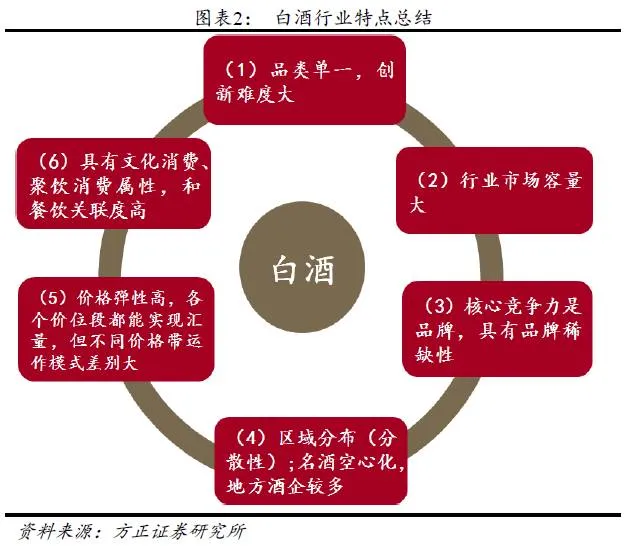 白酒作为消费品重要分支之一,拥有行业的众多属性,但在不断发展和进步的过程当中,也沉淀和衍化出了许多与众不同的特征,在《以史为鉴,新趋势下的白酒行业将走向何方--白酒板块深度解读》这篇报告中,我们从消费品研究框架的三个维度对白酒行业的特点进行了总结,其中主要包括:1)品类单一,创新难度大;2)白酒行业市场容量巨大;3)核心竞争力是品牌,品牌稀缺性是白酒一项重要属性;4)白酒呈现区域分布(分散性)——名酒空心化,地方酒企较多;5)价格弹性高,各个价位段都能实现汇量,但不同价格带的运作模式区别大;6)具有文化消费、聚饮消费的属性,和餐饮关联度高。根据行业所独有的几个主要特点,白酒企业在品牌、营销和渠道上不断地进行着探索和创新,也正是这些创新的存在,才让白酒行业生命之树常青。
