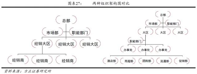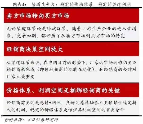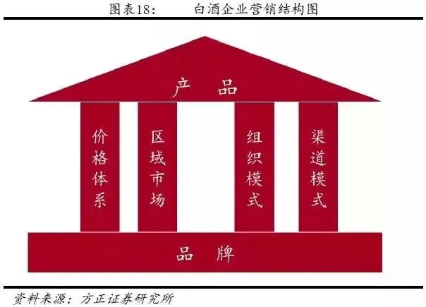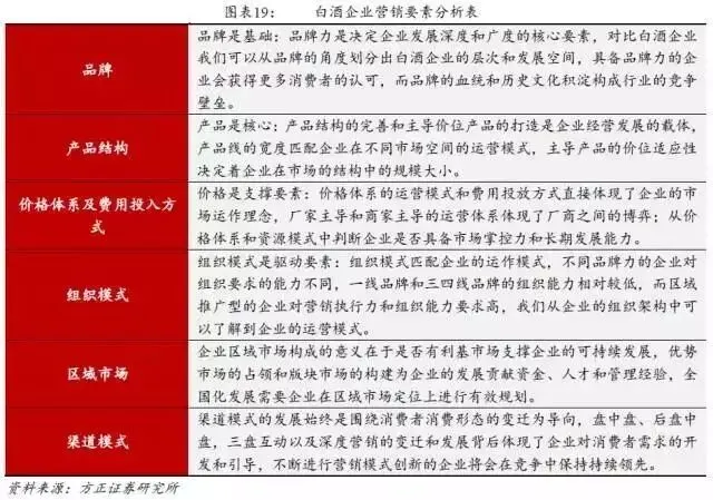 3、从营销要素解构酒水企业的运营:我们从品牌、产品结构、价格体系、组织模式、区域市场、渠道模式等六个要素对白酒营销体系进行了解构,这六大要素构成了企业基本的营销架构,也是体现出企业差异的地方,要重点指出的是模式可以学,但核心差异在于执行力,营销模式的形成需要不断的积累完善。酒企都需从自身定位出发,不断寻求适合自己的运作模式,同时也只有找到和自身资源禀赋相匹配的营销模式,才能在市场当中找到立足之地。