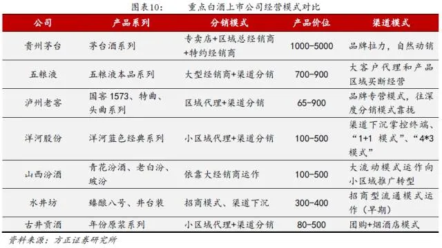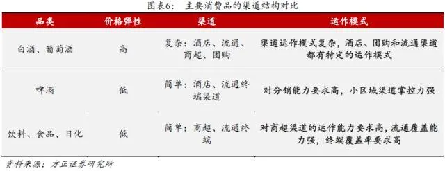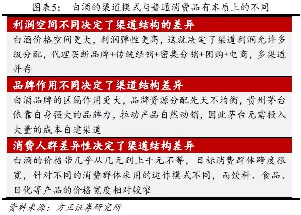 从行业属性来看,白酒的渠道模式与普通消费品有本质上的不同,这种差异主要是由渠道利润、品牌作用和消费人群等因素造成。白酒尤其是中高端以上价位的白酒,品牌附加值高,具有区域、文化属性,价格弹性大,可以拿出更多的费用来运作渠道等。