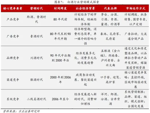 从七八十年代开始,白酒的营销开始步入一个创新轨道中,每一次创新都有一个先锋代表引领者行业的发展:从黔酒、汾酒依靠政府评比、计划批条不愁卖的时代到孔府家、秦池依靠广告拉动风靡大江南北;再到川酒改变依靠家门口的糖酒会招商模式开始做品牌,五粮液首创品牌拉动产品买断模式引领行业竞相模仿;徽酒依靠酒店和团购的“盘中盘”的渠道竞争模式取得行业领先,再到新竞争的时代,企业需要依靠品牌、产品结构、价格体系、组织设置、区域市场布局、资源及费用的投入模式等进行综合系统的竞争。