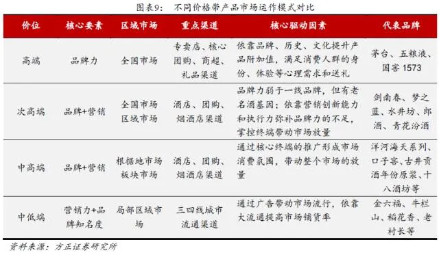 不同价位白酒的推广模式和渠道营销要素不同要求企业在营销资源和营销模式的推广进行相应的配置;不同价位的产品的渠道和营销策略存在较大的差异,产品定位和营销模式能否匹配是衡量产品运作能否成功的关键指标。高端酒运作的核心要素是品牌力,次高端酒的核心要素是品牌力和营销能力,中高端酒的核心要素是核心终端的掌控和营销推广能力,中低端的核心要素则是品牌知名度和网络分销能力。