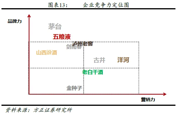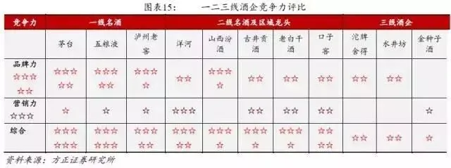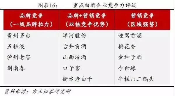 2、白酒行业竞争力的三个层次:作为有悠久历史的传统行业,白酒承载了很多历史、文化因素,所以区别于一般快消品行业,白酒的第一层次是品牌竞争,依靠品牌力在高端和全国范围市场竞争,比如贵州茅台、五粮液等一线酒企,拥有极强的品牌拉力,市场自然铺货率和自然动销率较高,业绩增长稳定;第二层次是品牌加营销的竞争,品牌力稍弱的企业依靠营销能力在中高端、次高端市场和以省为单位的区域市场竞争,其营销创新能力和渠道执行力较强,弥补了品牌力的相对不足,其区域拓展和产品结构提升有相对的优势,使企业的发展也能有一个比较大的发展空间;第三层次是营销力,一般是区域性强势企业,因其品牌知名度较弱,市场拓展范围受到一定局限,企业发展到一定规模就很难持续增长。
