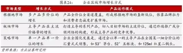 企业的区域—价位—产品增长模式:按照企业在不同的区域市场发展,我们总结出企业在不同市场发展的运营类型:在根据地市场企业一般是强势占有,市场份额高,品牌影响力大,产品结构覆盖大部分价格带,多产品运作,如古井贡酒在安徽市场的运作、老白干酒在河北市场。在板块市场,市场影响力减小,企业优势减弱,依靠资源和营销的推动实现主导产品在主流价格带的增长,如洋河在安徽、河南市场的运作。而具备全国品牌力的企业可以依靠自身品牌力,通过单一产品实现全国市场汇量式增长,如茅五剑、红星二锅头的市场。