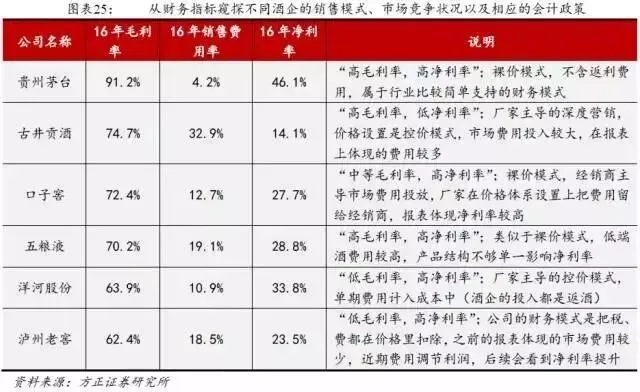 从财务指标看酒企背后模式:价格体系的运营模式和费用投放方式直接体现了企业的市场运作理念。一般情况下,我们可以从不同酒企毛利率、净利率、费用率等几个财务指标的对比中,窥探出它们所采用销售模式、市场竞争状况以及相应的会计政策。从几家较为典型的白酒的对比中可以发现,茅台凭借它自身的品牌拉力,拥有最高的毛利率、净利率,以及最低的销售费用率。洋河、古井和五粮液的毛利率和净利率差异非常大,泸州老窖和洋河的毛利率不高,但是净利率很高,因为洋河和泸州老窖把一部分费用都计入了成本,而古井贡酒则计入了费用。另外,老窖把一部分费用在表外已经扣除,报表较为“干净”。而古井采用的高毛利、高费用,则反应出了徽酒激烈的竞争格局。