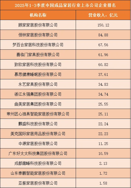 根据申万行业分类,2025年1-3季度中国成品家居行业上市公司按营业收入排名如下:(A股上市公司)