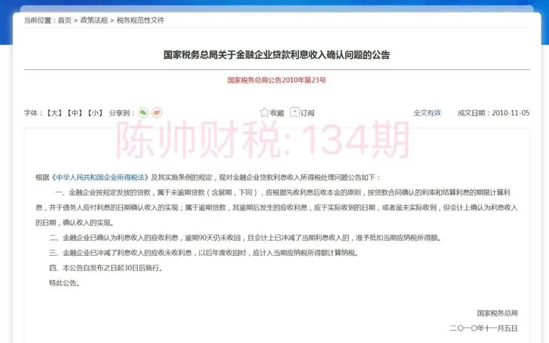 5 . 《国家税务总局关于金融企业贷款利息收入确认问题的公告》(国家税务总局公告2010年第23号。)