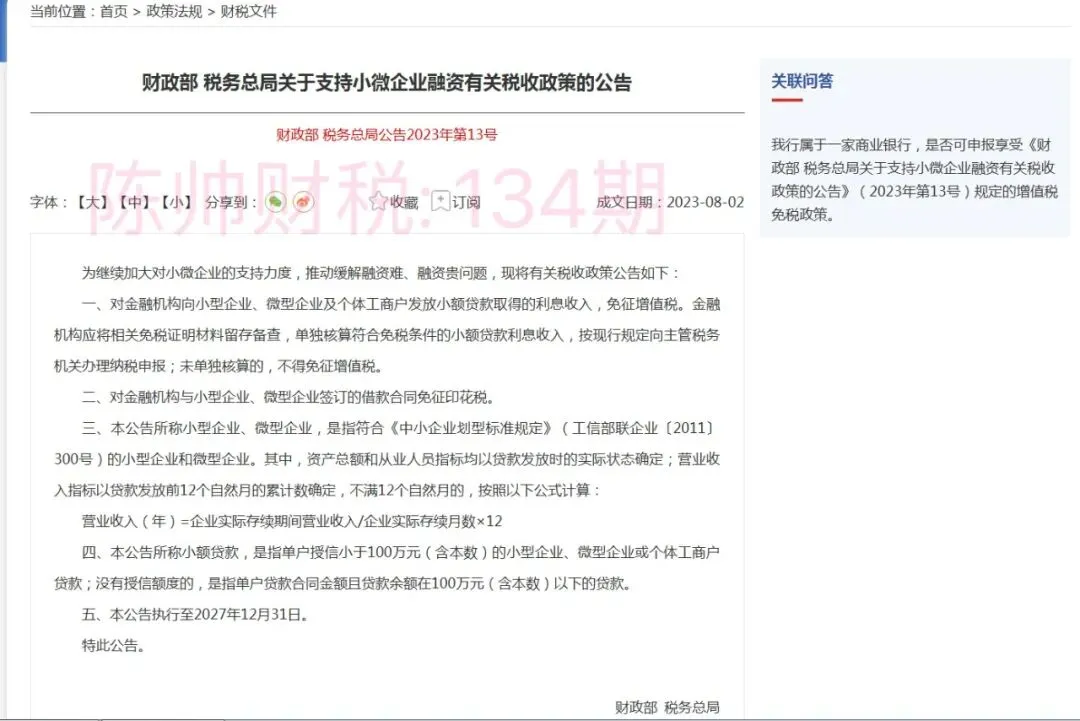 6 . 《财政部税务总局关于支持小微企业融资有关税收政策的公告》(财政部税务总局公告2023年第13号,本公告执行至2027年12月31日。)