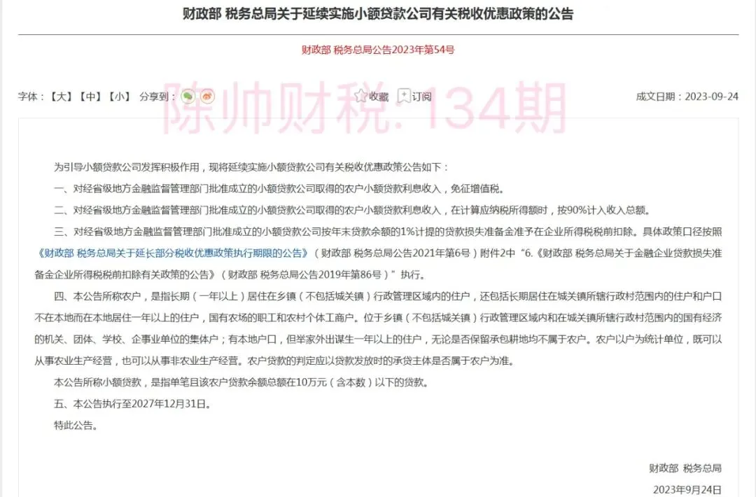 8 . 《财政部税务总局关于延续实施小额贷款公司有关税收优惠政策的公告》(财政部税务总局公告2023年第54号,本公告执行至2027年12月31日。)
