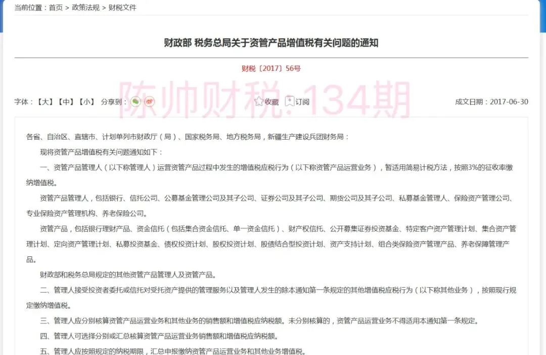 11 . 《财政部税务总局关于资管产品增值税有关问题的通知》(财税〔2017〕56号)。