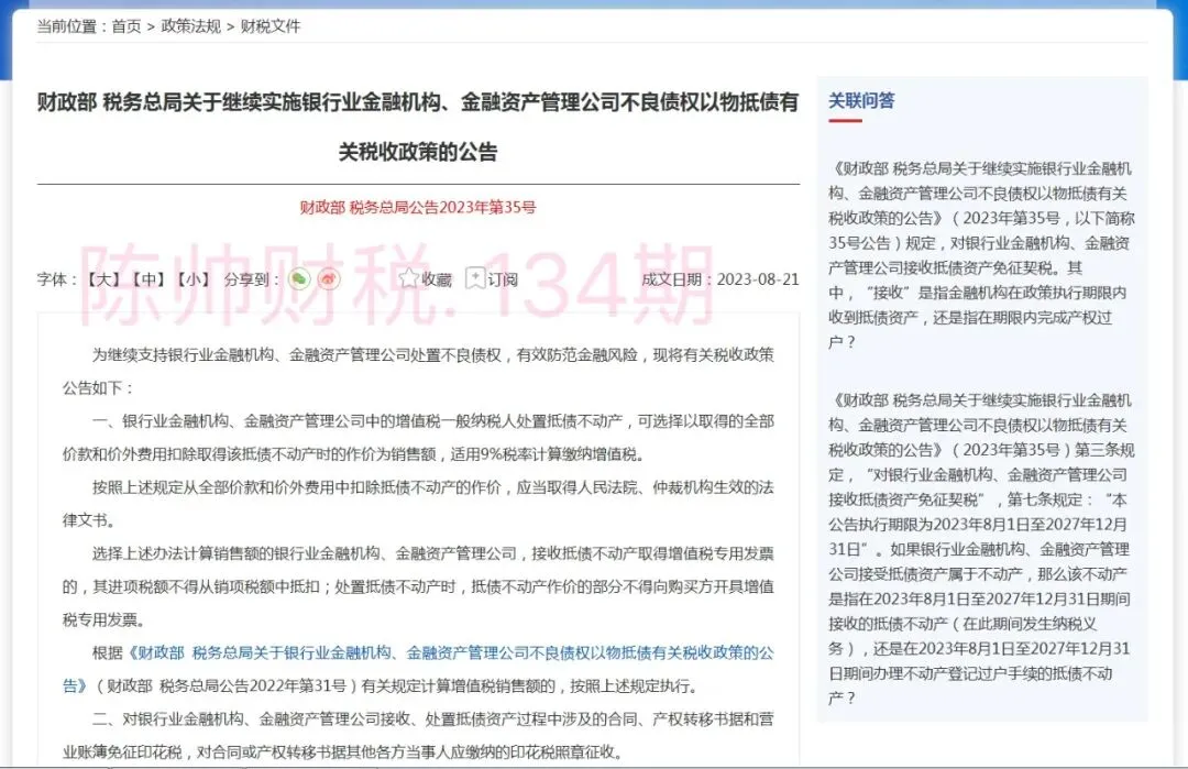 12 . 《财政部税务总局关于继续实施银行业金融机构、金融资产管理公司不良债权以物抵债有关税收政策的公告》(财政部税务总局公告2023年第35号,本公告执行期限为2023年8月1日至2027年12月31日);
