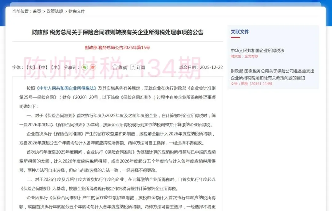 3 . 《财政部税务总局关于保险合同准则转换有关企业所得税处理事项的公告》(财政部 税务总局公告2025年第15号,2025年12月22日发布)