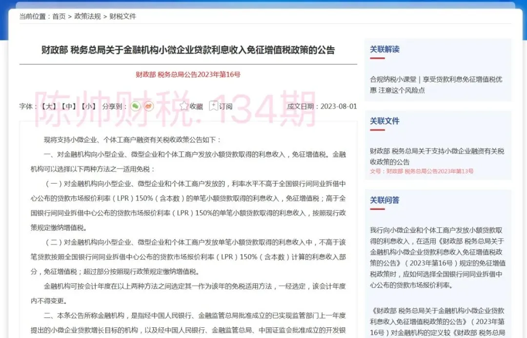 7 . 《财政部税务总局关于金融机构小微企业贷款利息收入免征增值税政策的公告》(财政部税务总局公告2023年第16号,本公告执行至2027年12月31日。)