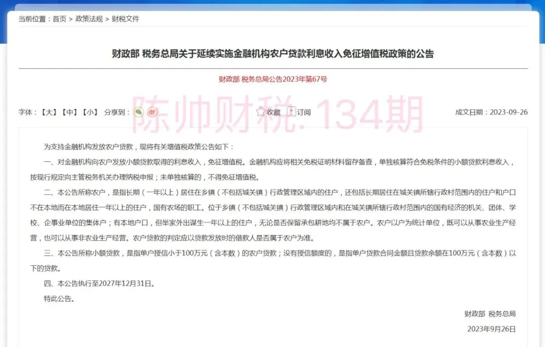9 . 《财政部税务总局关于延续实施金融机构农户贷款利息收入免征增值税政策的公告》(财政部税务总局公告2023年第67号,本公告执行至2027年12月31日。)