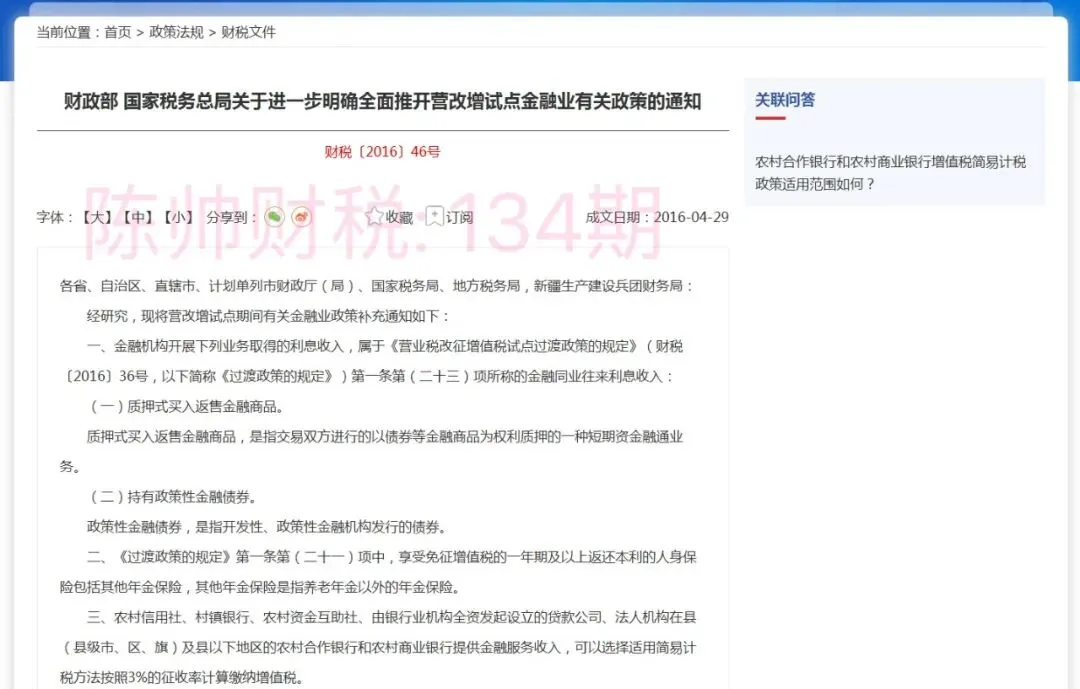 10 . 《财政部国家税务总局关于进一步明确全面推开营改增试点金融业有关政策的通知》(财税〔2016〕46号);