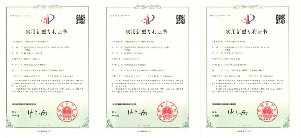 天众生物非常重视产品开发与技术创新,申请发明专利10项,现已审批实用新型专利15项。现如今,天众生物转战饮料行业,用远超行业的发酵工艺+数亿的后备资金流+完善的售后推广+百万合伙人扶持计划对行业进行降维打击。