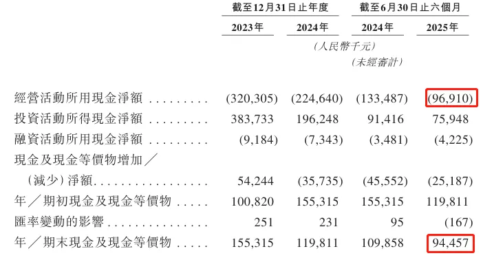 截至2025年6月30日,公司账上现金有人民币0.94亿元,经营活动现金流为-0.97亿元。