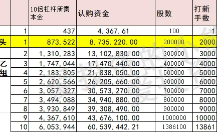 甲组的各档融资所需要的本金还有融资金额对应如下表:
