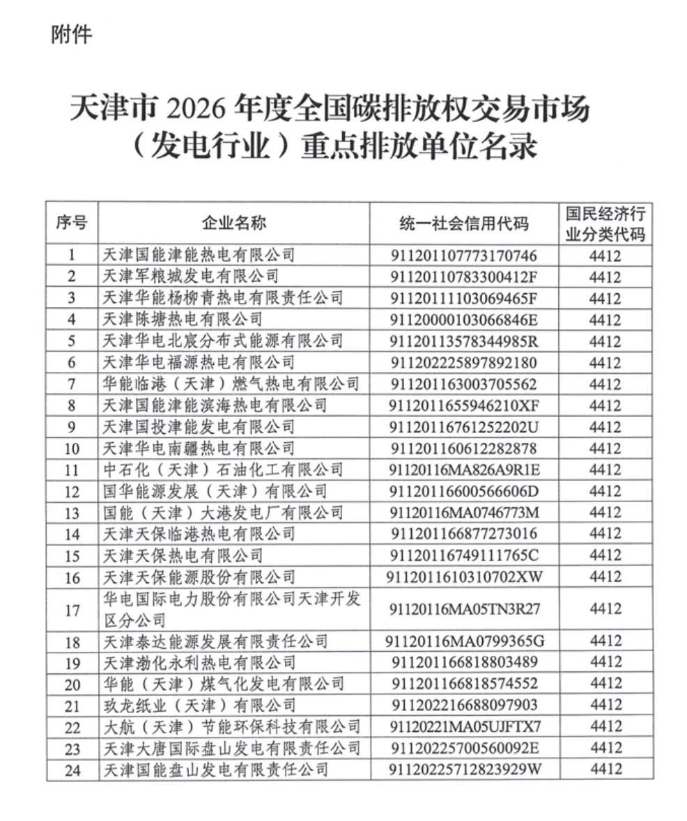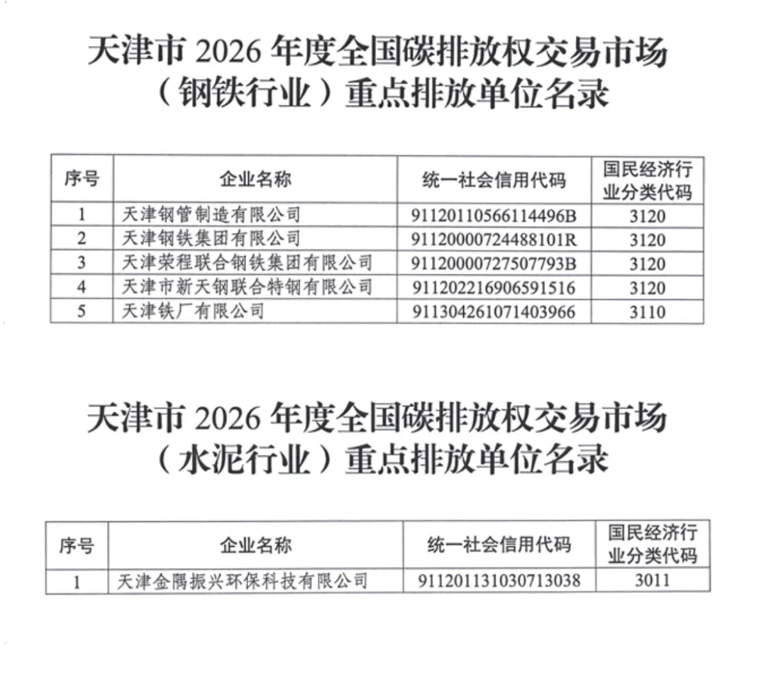 天津市2026年度纳入全国碳排放权交易市场共24家,其中钢铁5家,水泥1家。