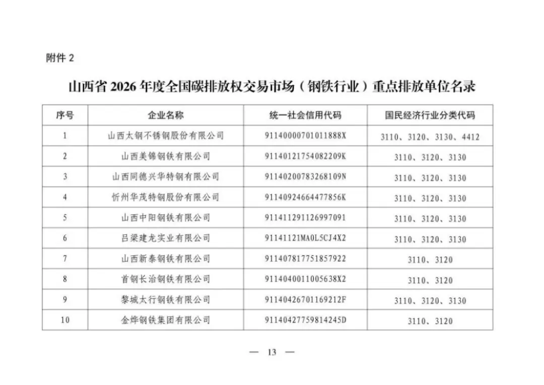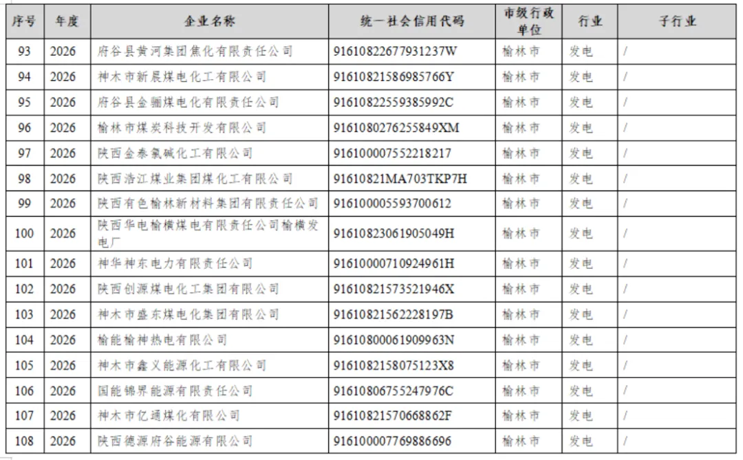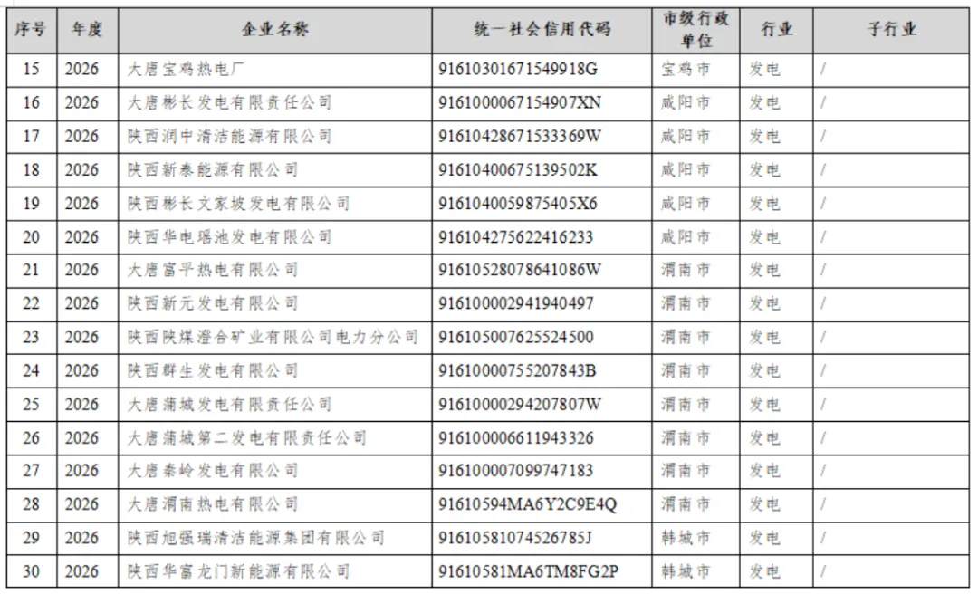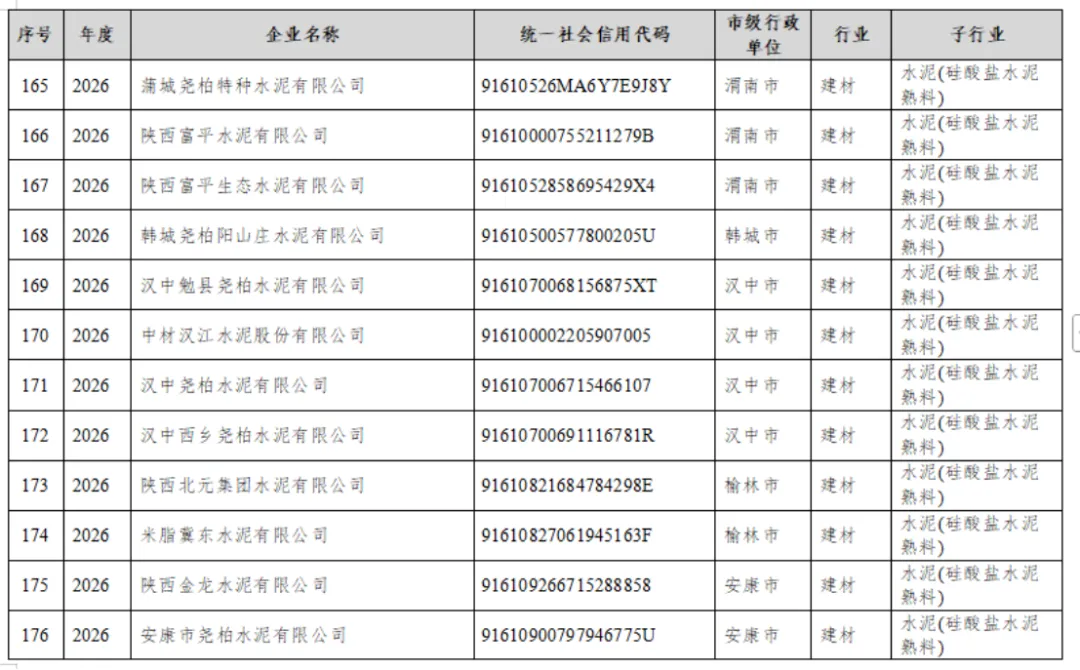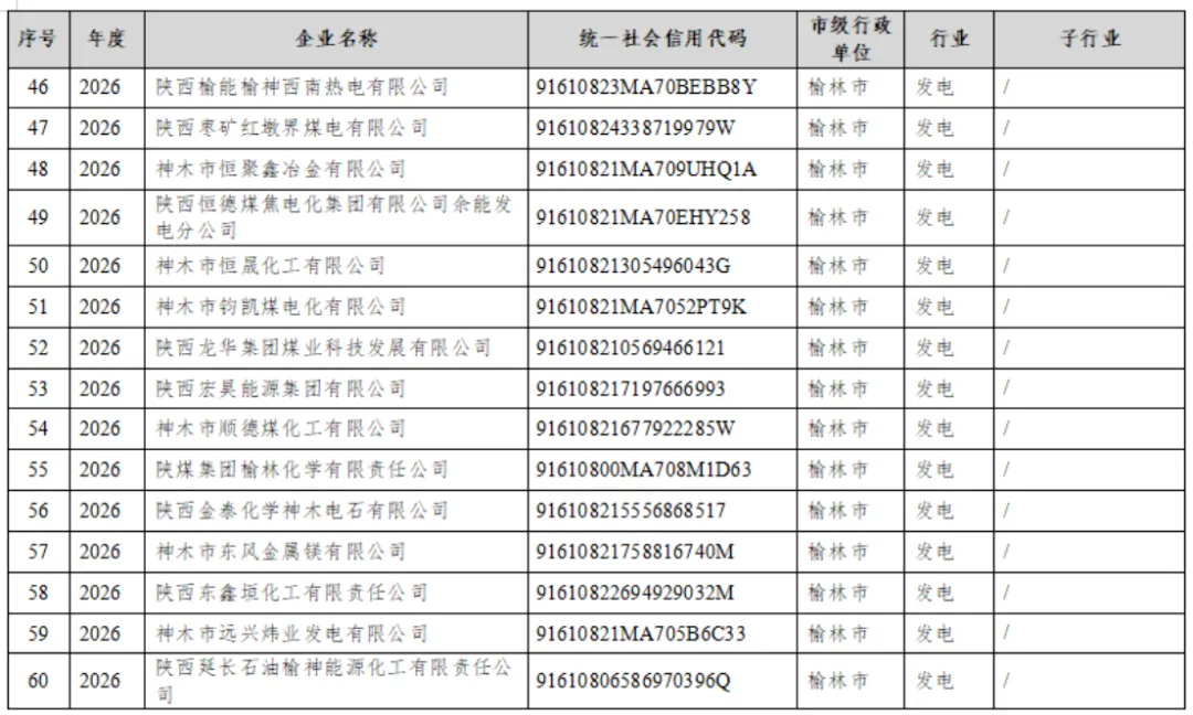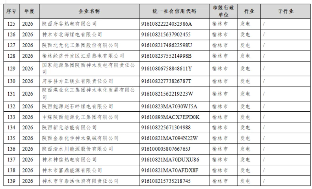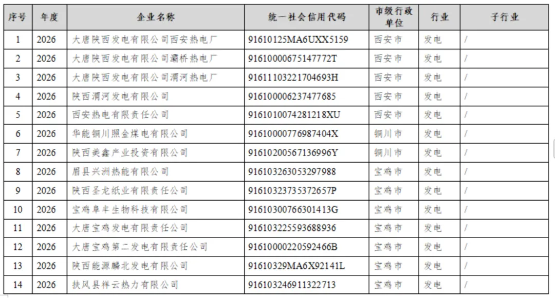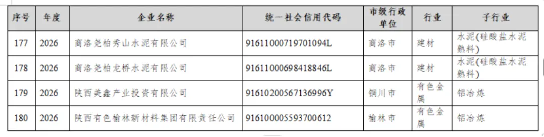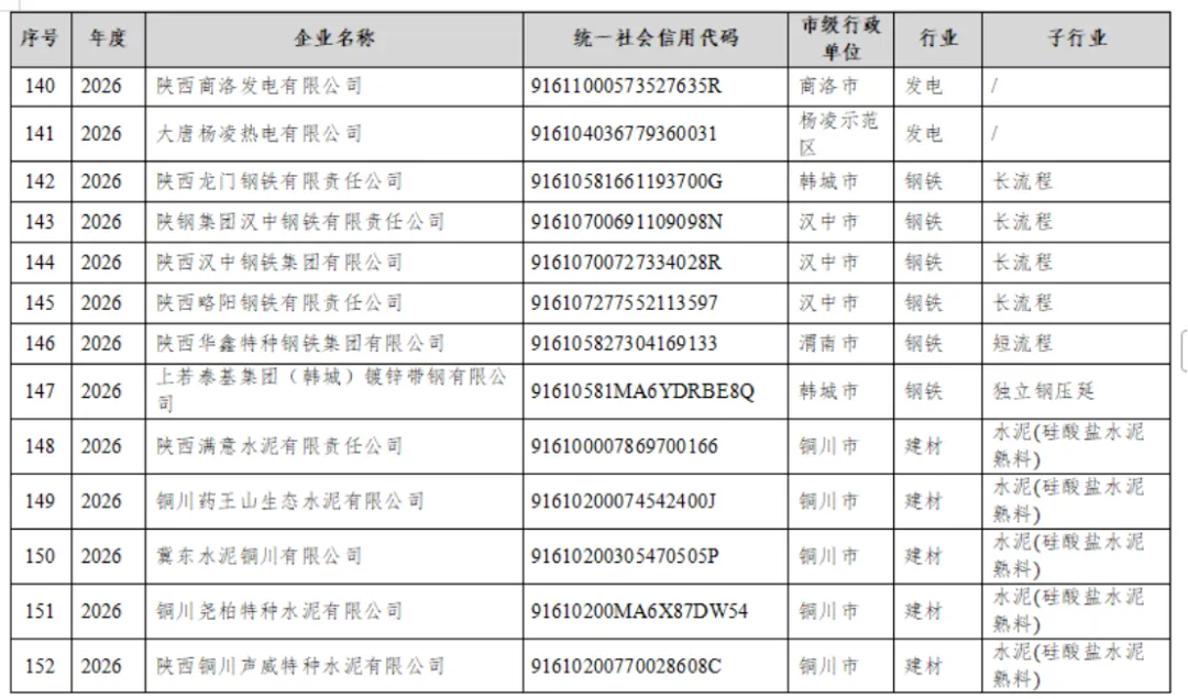 陕西省2026年度纳入全国碳排放权交易市场共180家,其中发电141家,钢铁6家,水泥31家,铝冶炼2家。