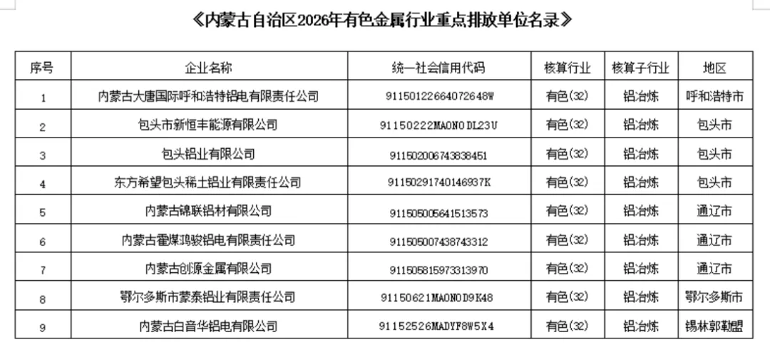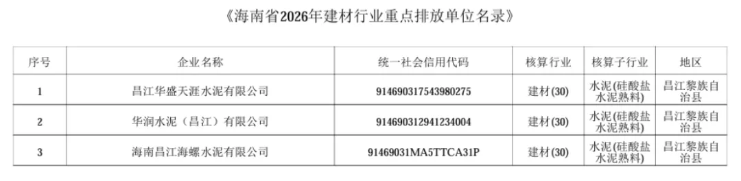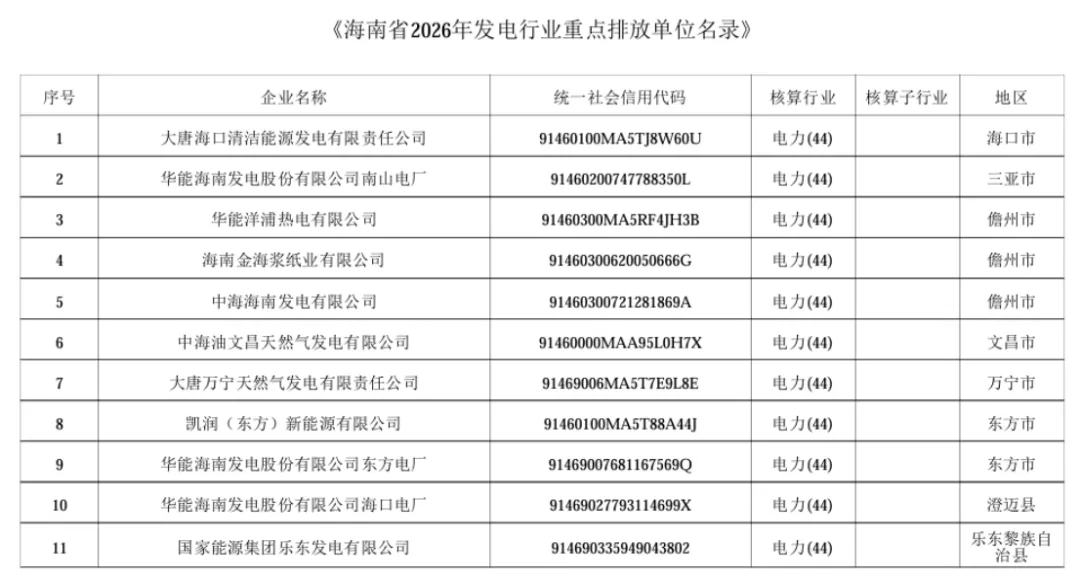 海南省2026年度发电、钢铁、水泥、铝冶炼行业温室气体重点排放单位名录共14家,其中发电11家,水泥3家。