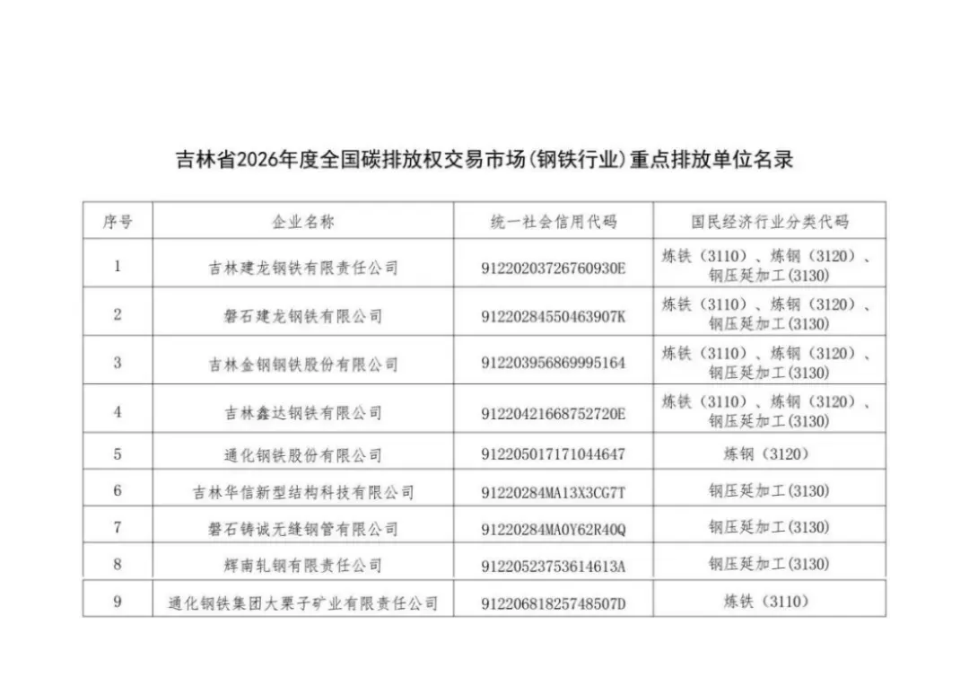 吉林省2026年度纳入全国碳排放权交易市场共66家,其中发电46家,钢铁9家,水泥11家。
