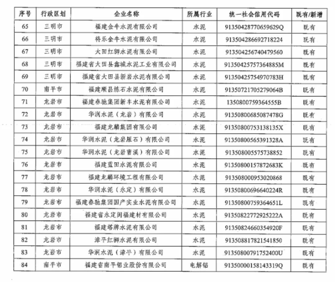 福建省2026年度纳入全国碳排放权交易市场共84家,其中发电44家,钢铁11家,水泥28家,铝冶炼1家。