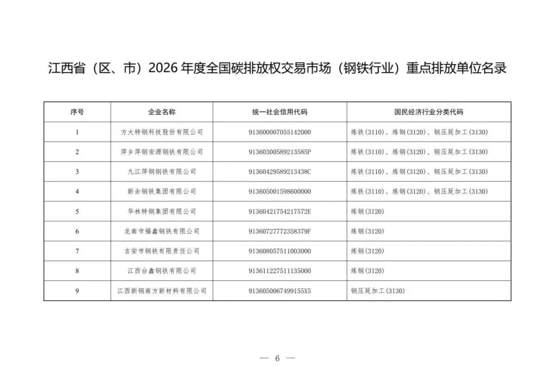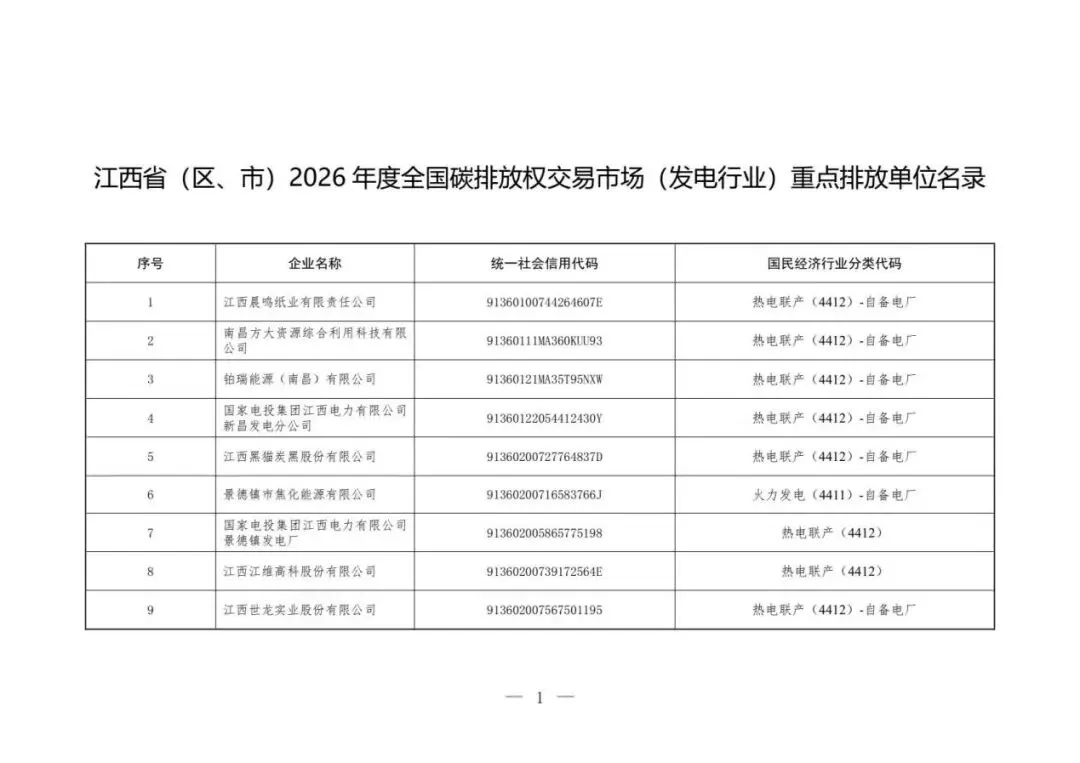 江西省2026年度纳入全国碳排放权交易市场共96家,其中发电56家,钢铁9家,水泥31家。