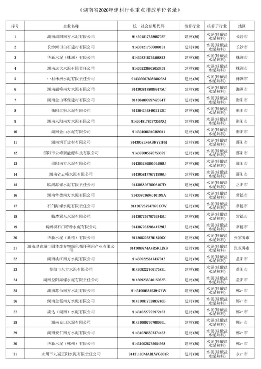 湖南省2026年度纳入全国碳排放权交易市场共84家,其中发电34家,钢铁4家,水泥45家,铝冶炼1家。