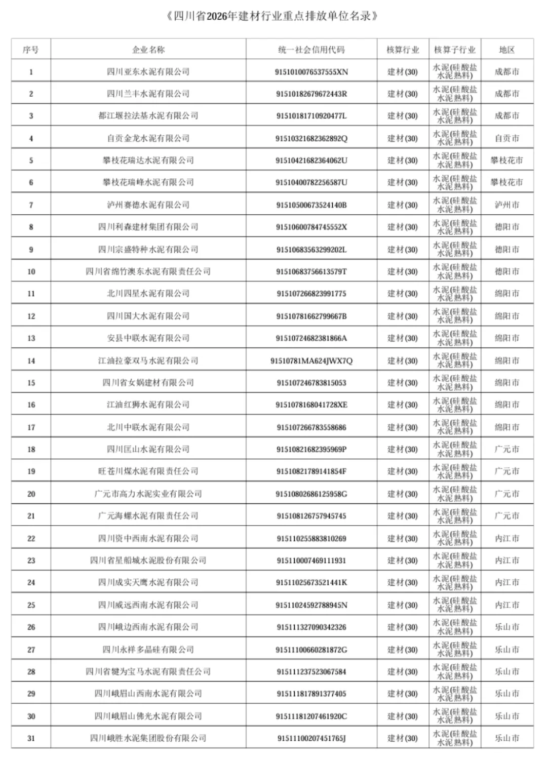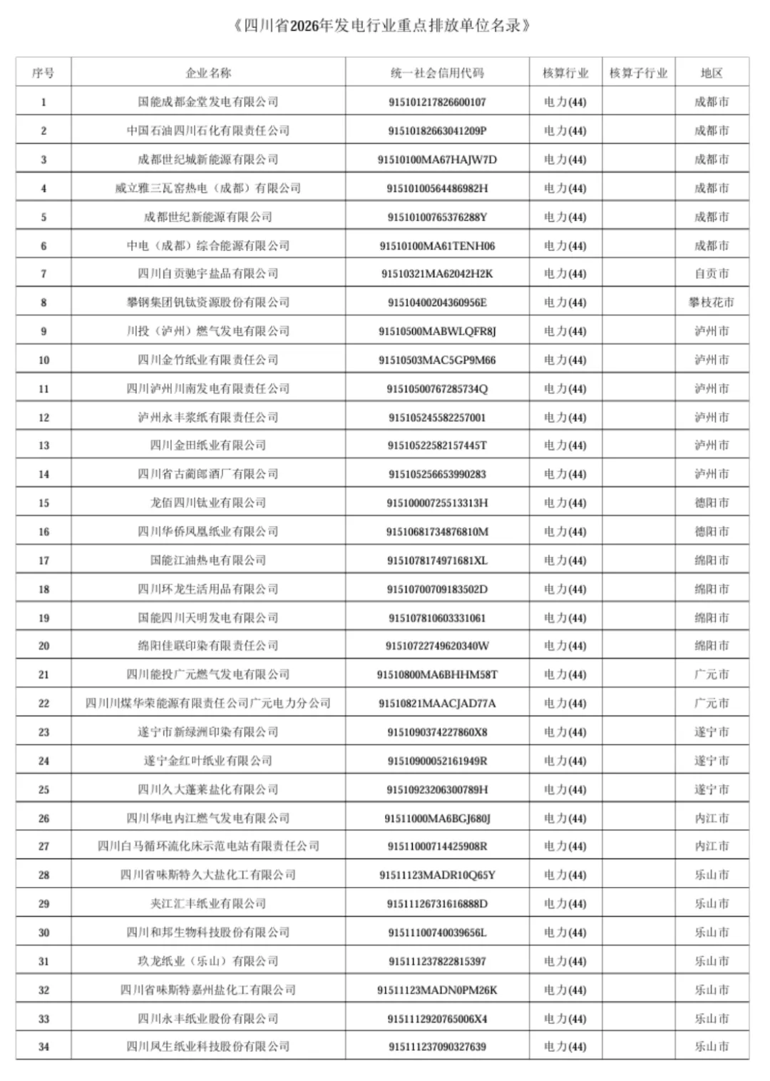 四川省2026年度纳入全国碳排放权交易市场共132家,其中发电55家,钢铁5家,水泥66家,铝冶炼6家。