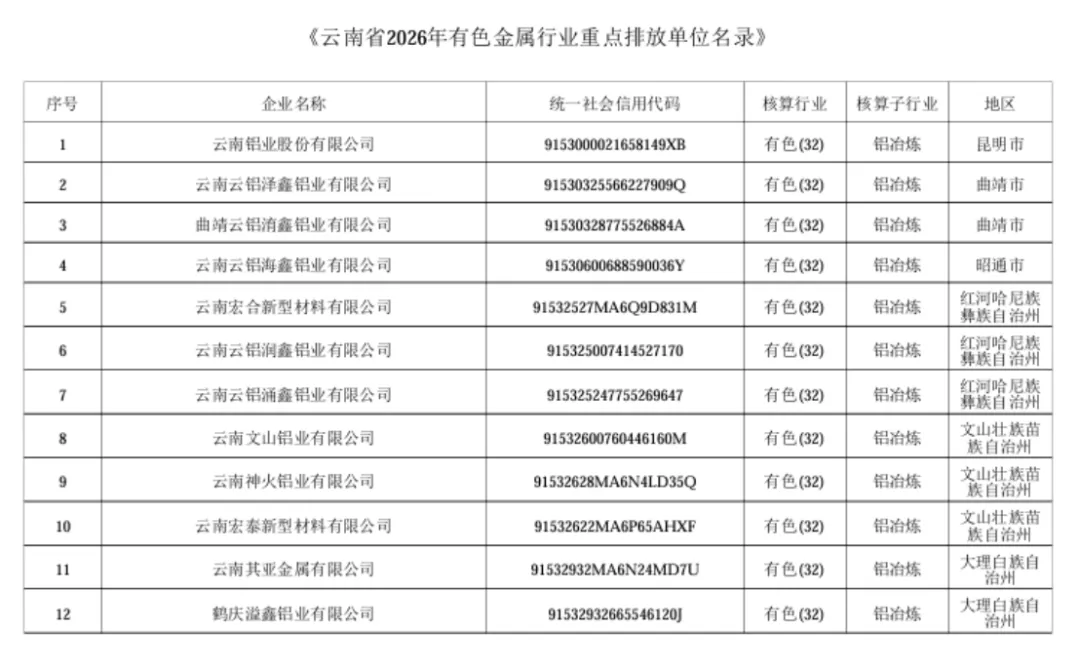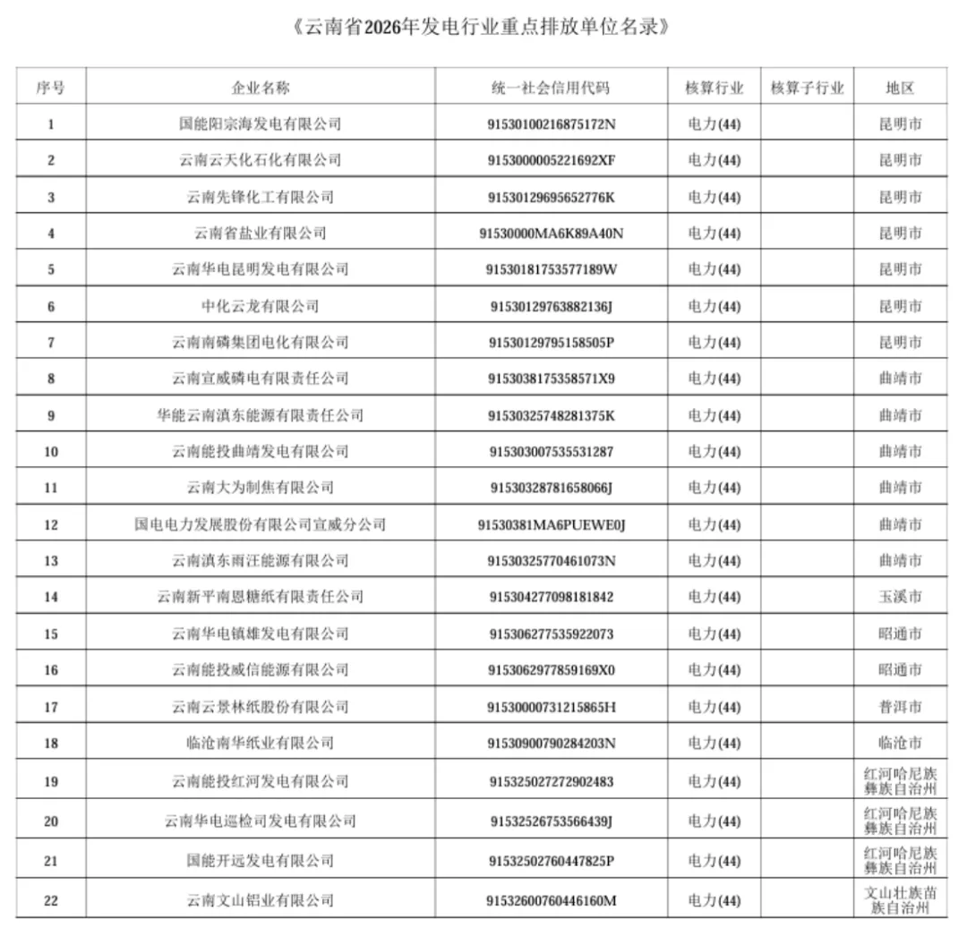 云南省2026年度纳入全国碳排放权交易市场共95家,其中发电2家,钢铁6家,水泥75家,铝冶炼12家。
