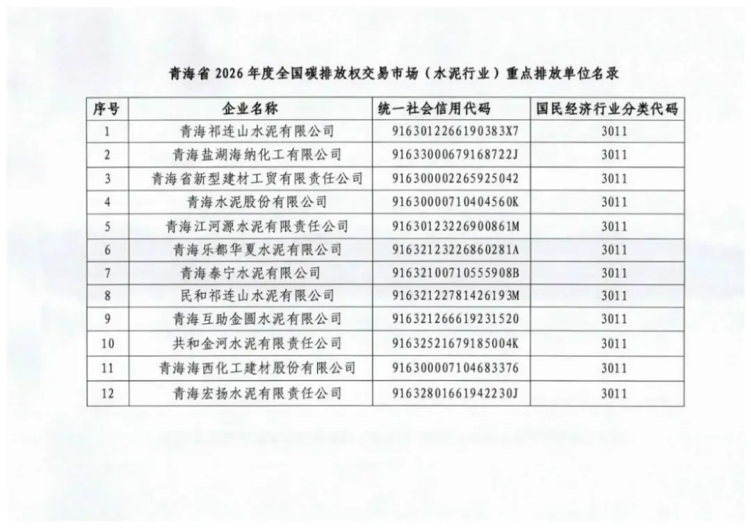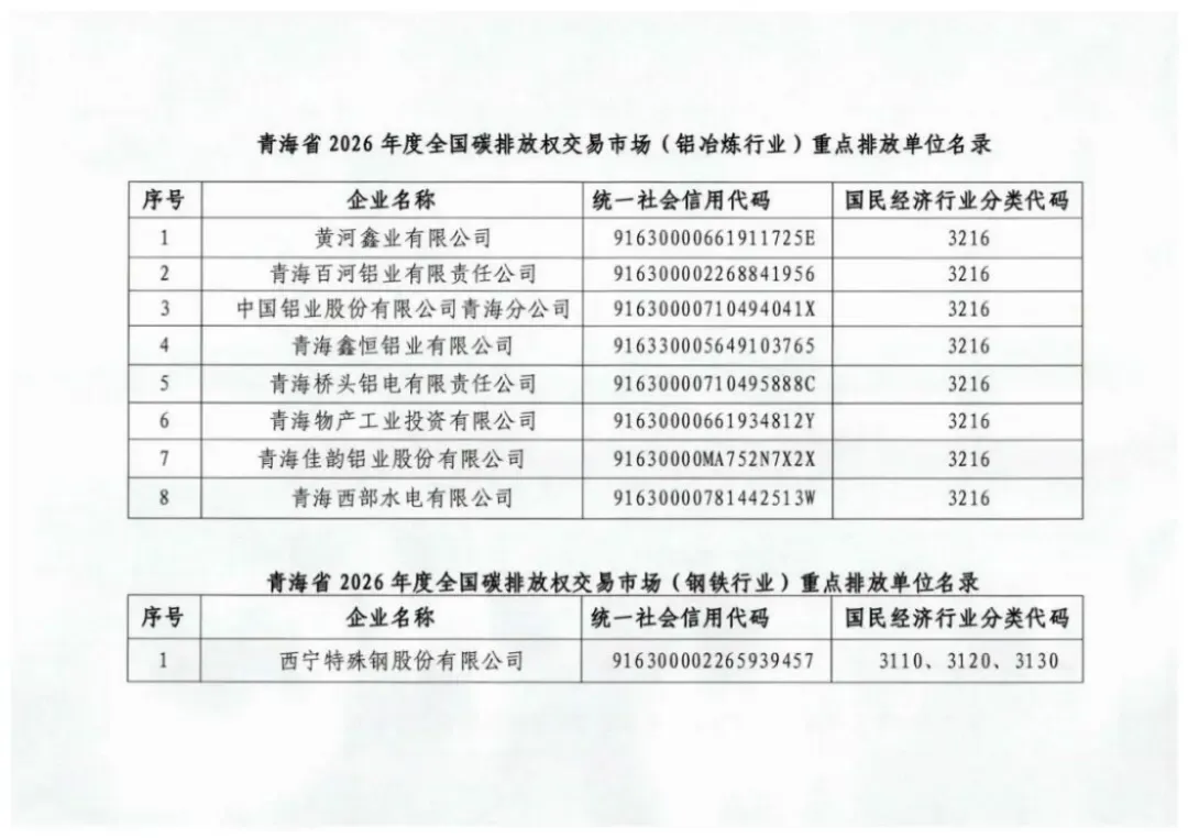 青海省2026年度纳入全国碳排放权交易市场共35家,其中发电14家,钢铁1家,水泥12家,铝冶炼8家。