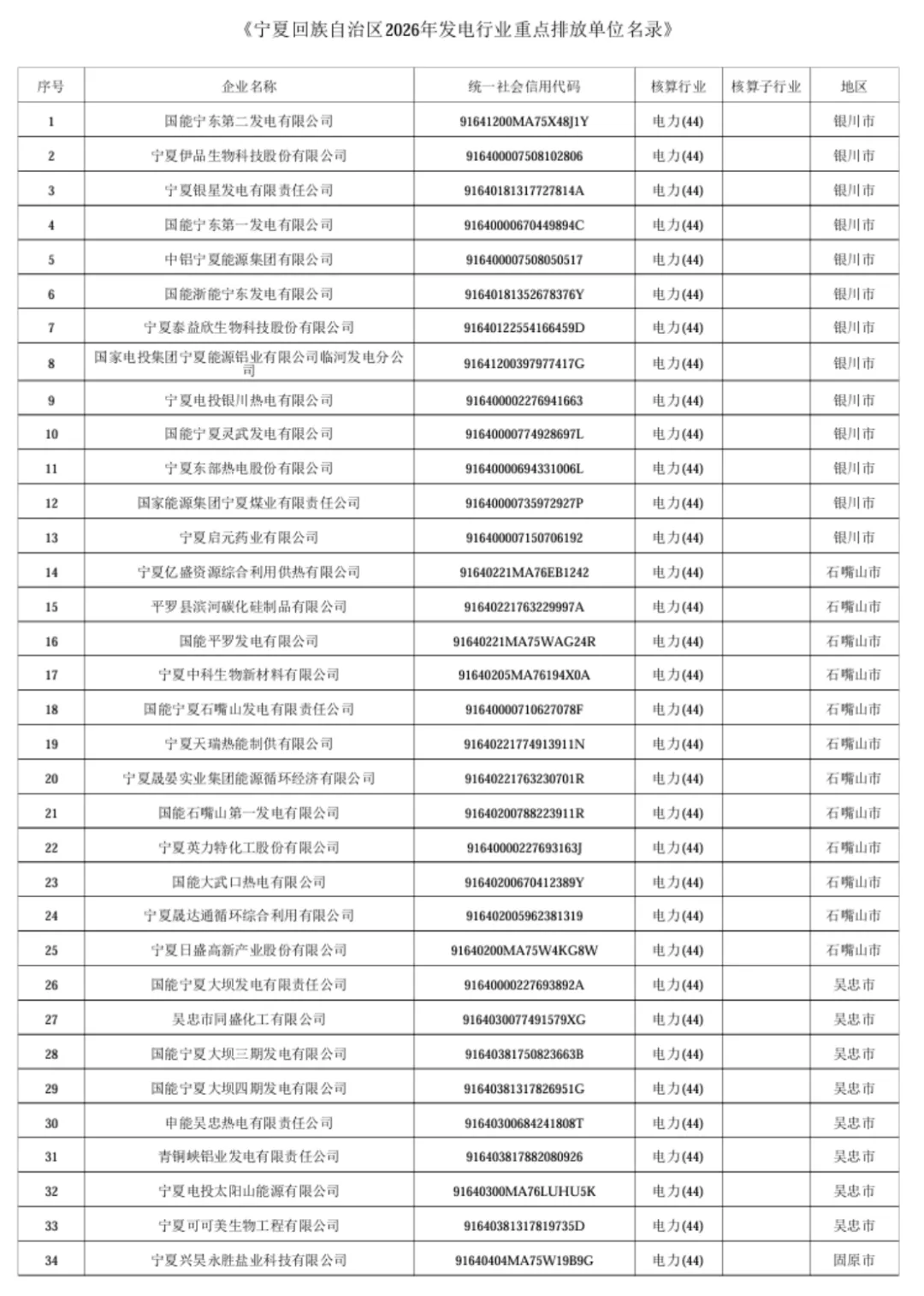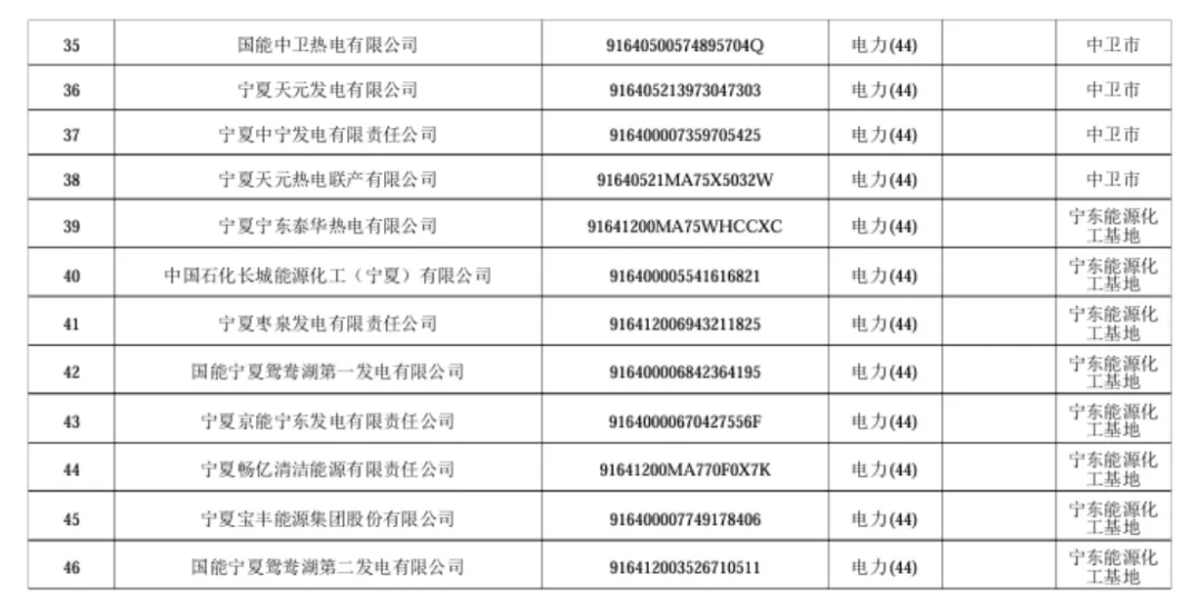 宁夏2026年度纳入全国碳排放权交易市场共68家,其中发电46家,钢铁4家,水泥15家,铝冶炼3家。