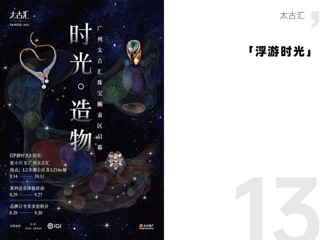 广州太古汇找到了广州美术学院雕塑系艺术家张小川,联合打造「浮游时光」装置艺术展览。钟表区展出表现浮游生命状态的沙漏,寓意生灵生生不息。珠宝区以装置、投影和荧光插画的创意形式,探索浮游生物和珠宝的微观世界。