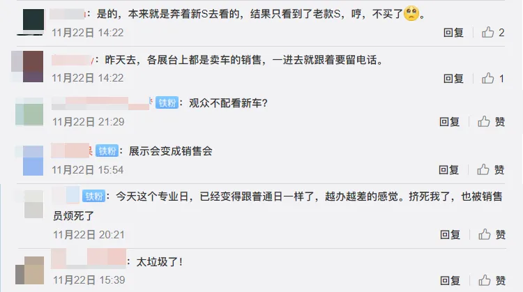 与所有车展一样,车展后都会有一种声音,认为广州车展已经渐渐变成了“展销会”。有网友表示,“各展台上都是卖车的销售,一进去就跟着要留电话。”还有网友评论,“这个专业日已经变得跟普通日一样了,越办越差的感觉。”