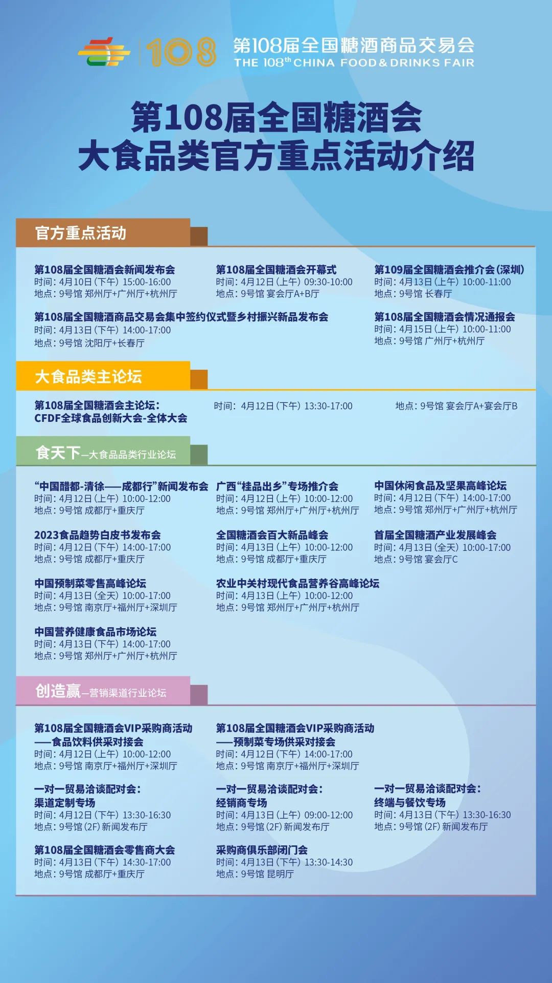 休闲食品饮品及乳制品、调味品及配料、预制菜食材及进口食品、食品机械、食品包装及设计。