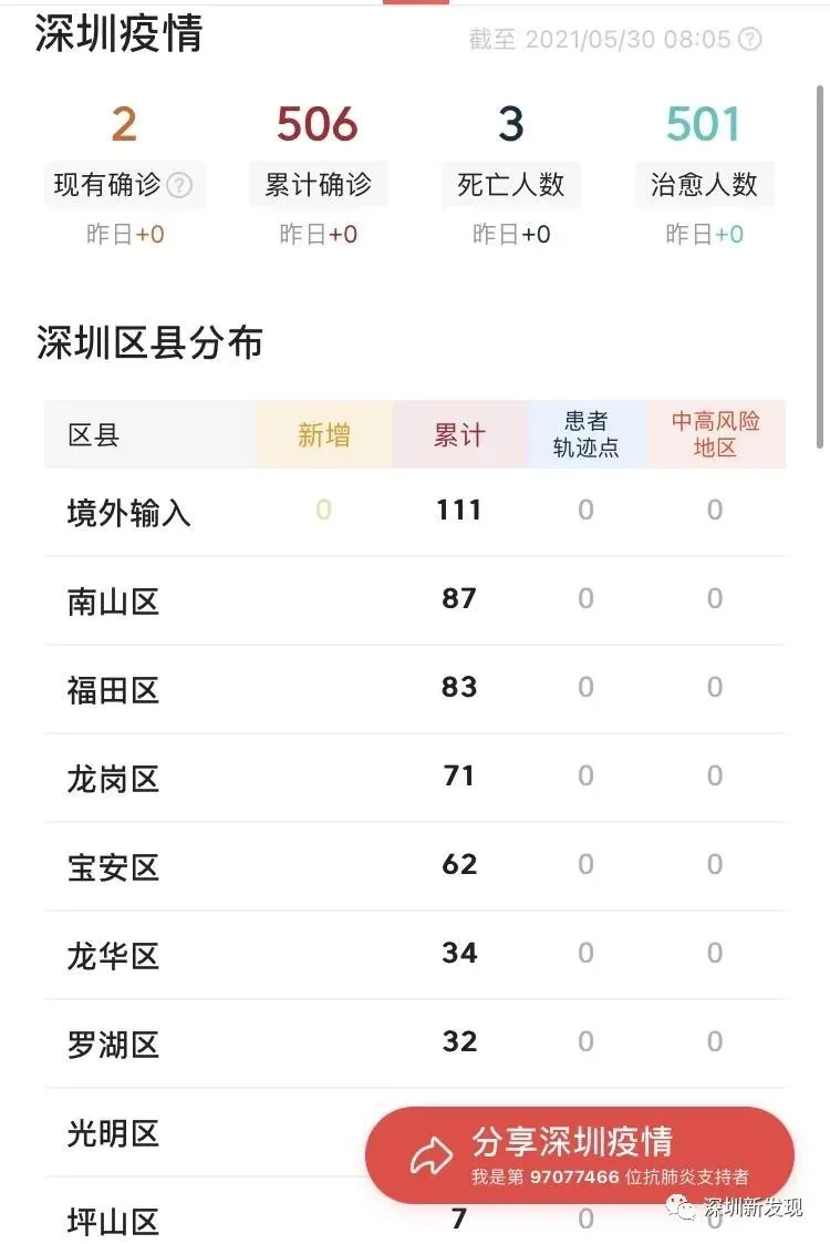 5月30日,深圳新报告2例,自"5. 21"疫情以来,深圳全市已累计报告无症状感染者13例。