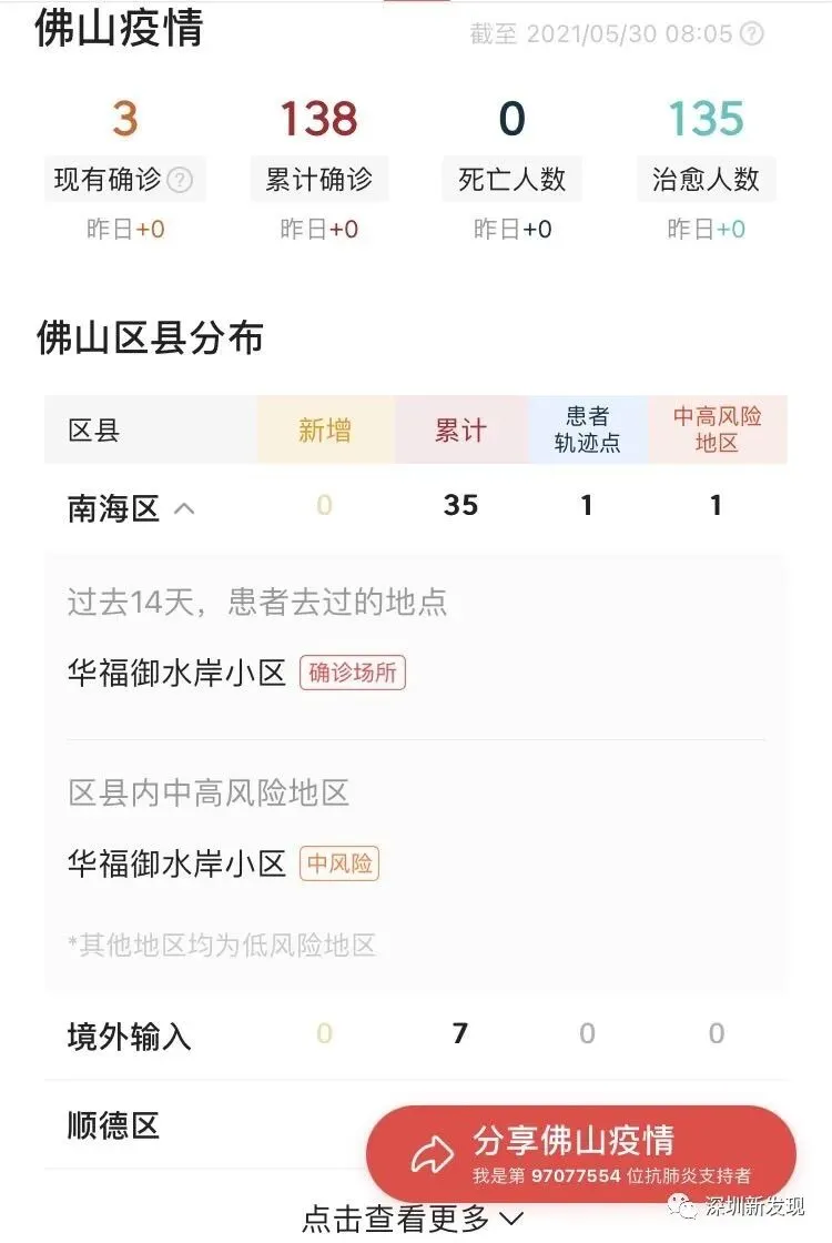 2021年5月30日止,佛山在对广州通报的核酸初筛阳性人员排查中发现1例本土新冠病毒无症状感染者。