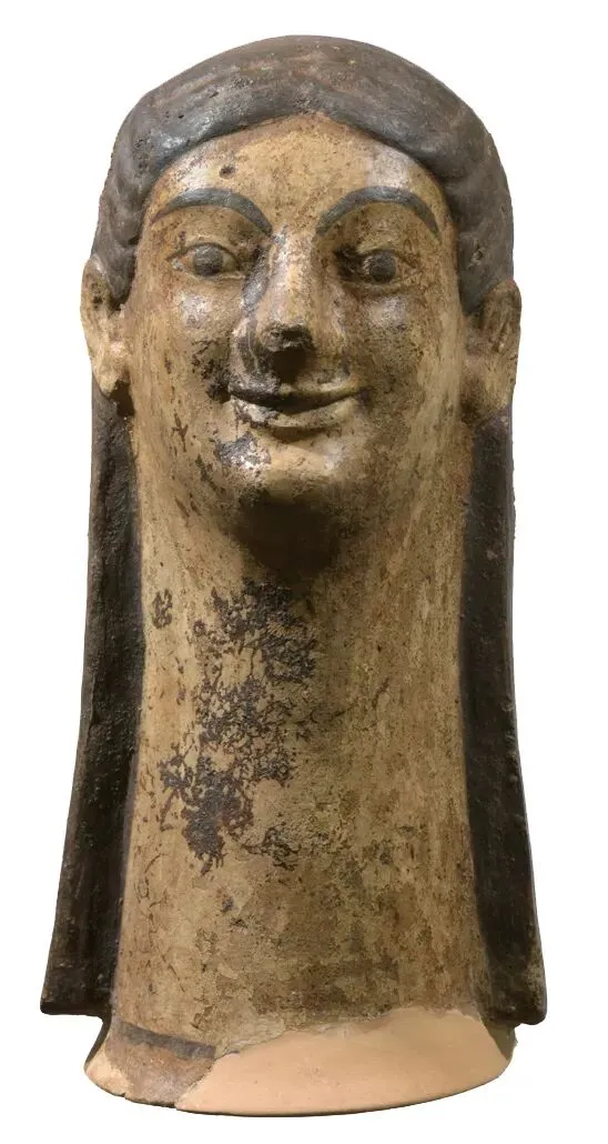公元前6世纪以来,伊特鲁里亚城市中出现了神庙和圣所一类的公共纪念性场所。这件陶制雕像是神庙的顶部装饰物,可能是一件三角形山墙装饰。这件雕像描绘了斯芬克斯的头像。斯芬克斯是神话中一种有着狮身人面的动物,通常还长着翅膀。