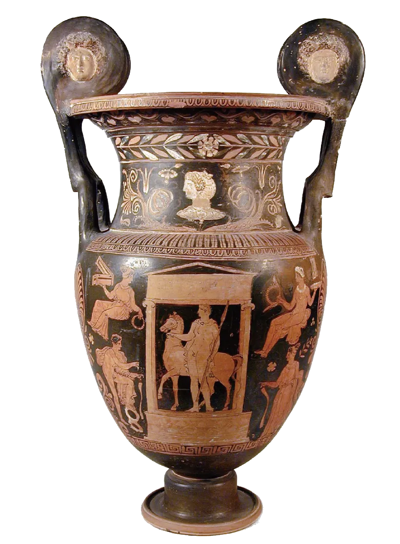 从公元前8世纪上半叶开始,意大利南部开始受到希腊文化的影响。公元前5世纪中叶后不久,大希腊的一些中心发展出了一种仿雅典制的红绘陶器。这件克雷特皿把手上装饰着两个浮雕的美杜莎面具。器身上描绘了丧葬仪式的场景。