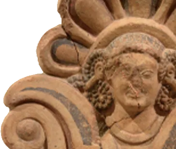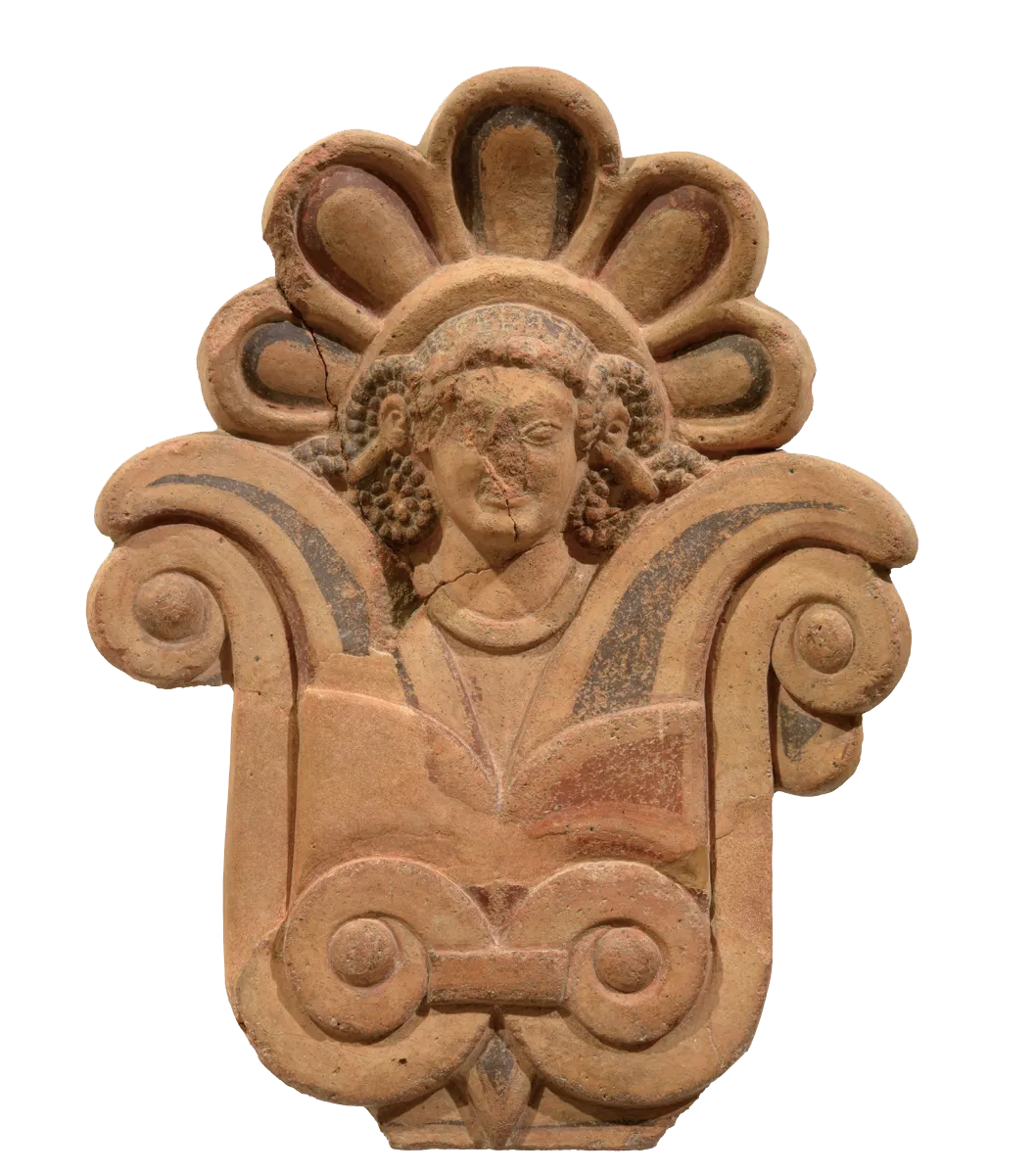 此件瓦檐饰表现为一位女性的面容,其乌黑的头发缠绕在耳后,从莲花中浮现出来。莲花的图案自地中海东部传入,伊特鲁里亚人将其用作装饰图案和纯洁的象征。女孩的头像被花瓣装饰(光环)包围,让人想起贝壳图案。