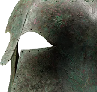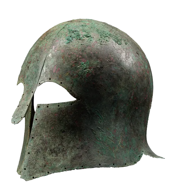 伊特鲁里亚男性的力量主要体现为:全副武装、保卫自己的家族和财产,因此男性墓葬中经常发现武器、马具、战车、权杖等武力、财富和社会地位的象征物。科林斯式头盔几乎完全覆盖面部和颈部,只在眼睛和嘴巴处留下细缝。这种头盔得名于其产地——希腊城市科林斯,并从科林斯传播到意大利。