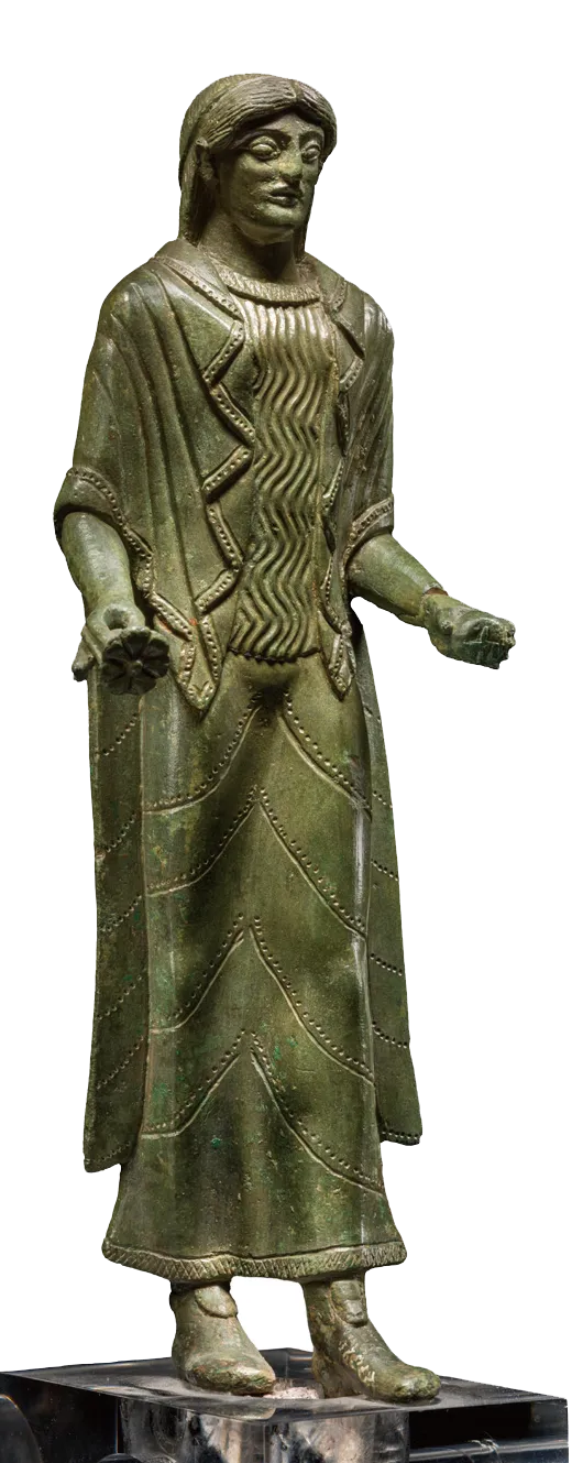 这尊雕像是向神灵敬献供品的女子形象。制作向神灵敬献动物、信徒或神灵的青铜雕像是伊特鲁里亚地区的习俗,用于感谢神的恩典或祈求神的庇佑。这名女子身着束腰紧身长袍,肩披宽大斗篷,以窄丝带束发,手持象征生育的花朵和石榴,衣物上饰有精致几何纹样。